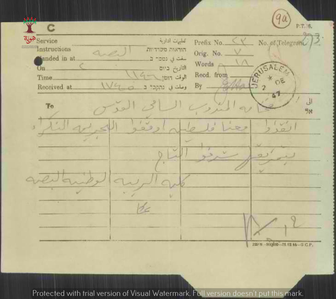 تلغراف مرسل من كلية الريبة الوطنية بالبصة الى المندوب السامي احتجاجا على قرار تقسيم فلسطين