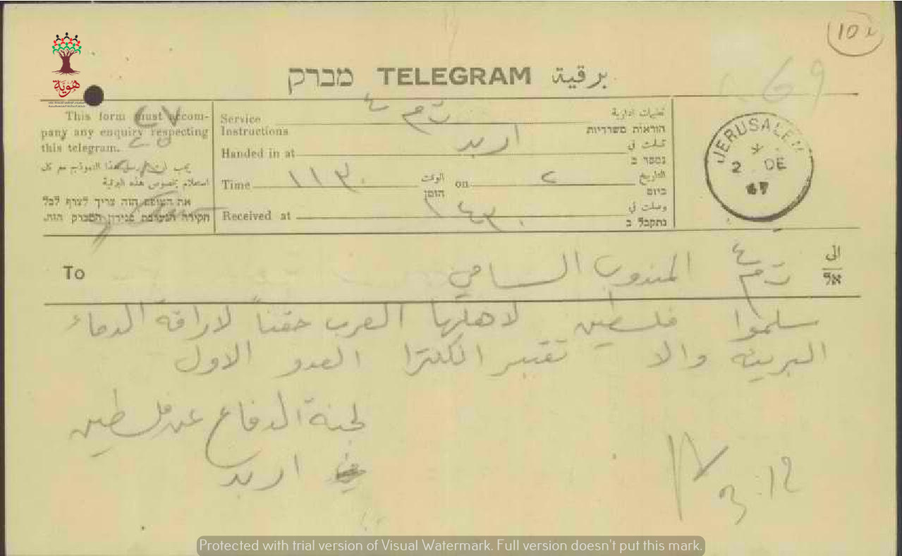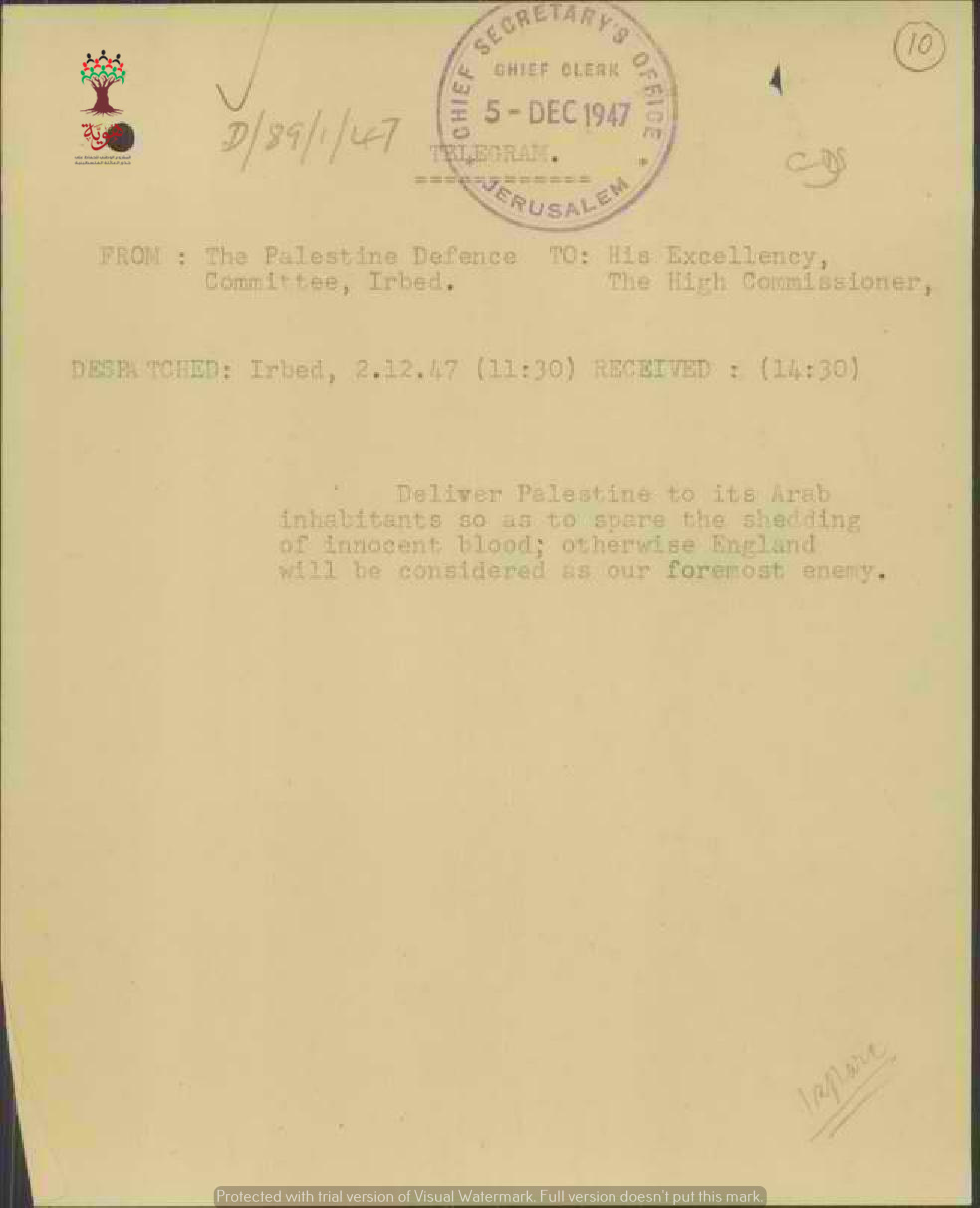 تلغراف مرسل من لجنة الدفاع عن فلسطين في اربد الى المندوب السامي احتجاجا على قرار تقسيم فلسطين