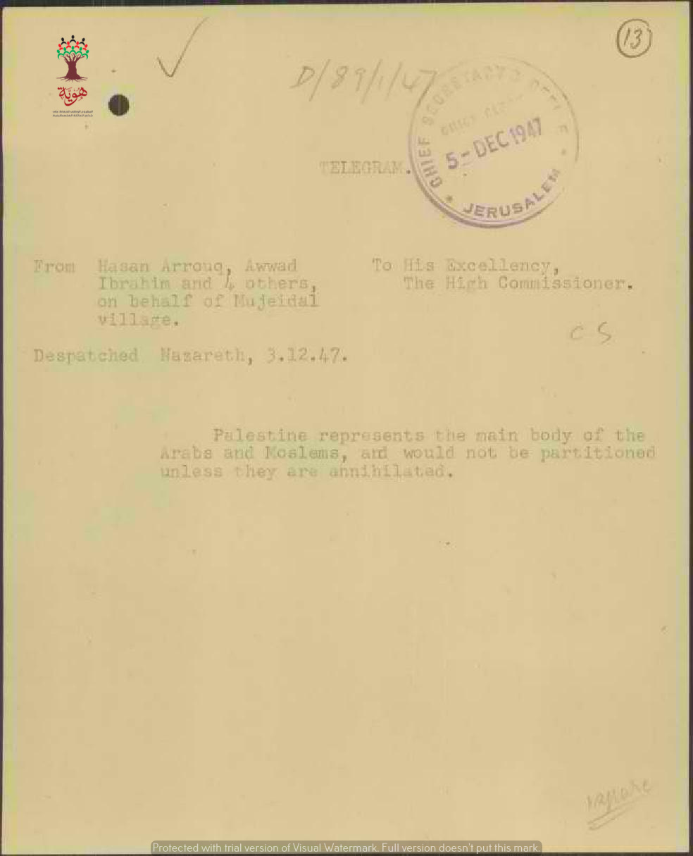 تلغراف مرسل من اهالي المجيدل الى المندوب السامي احتجاجا على قرار تقسيم فلسطين