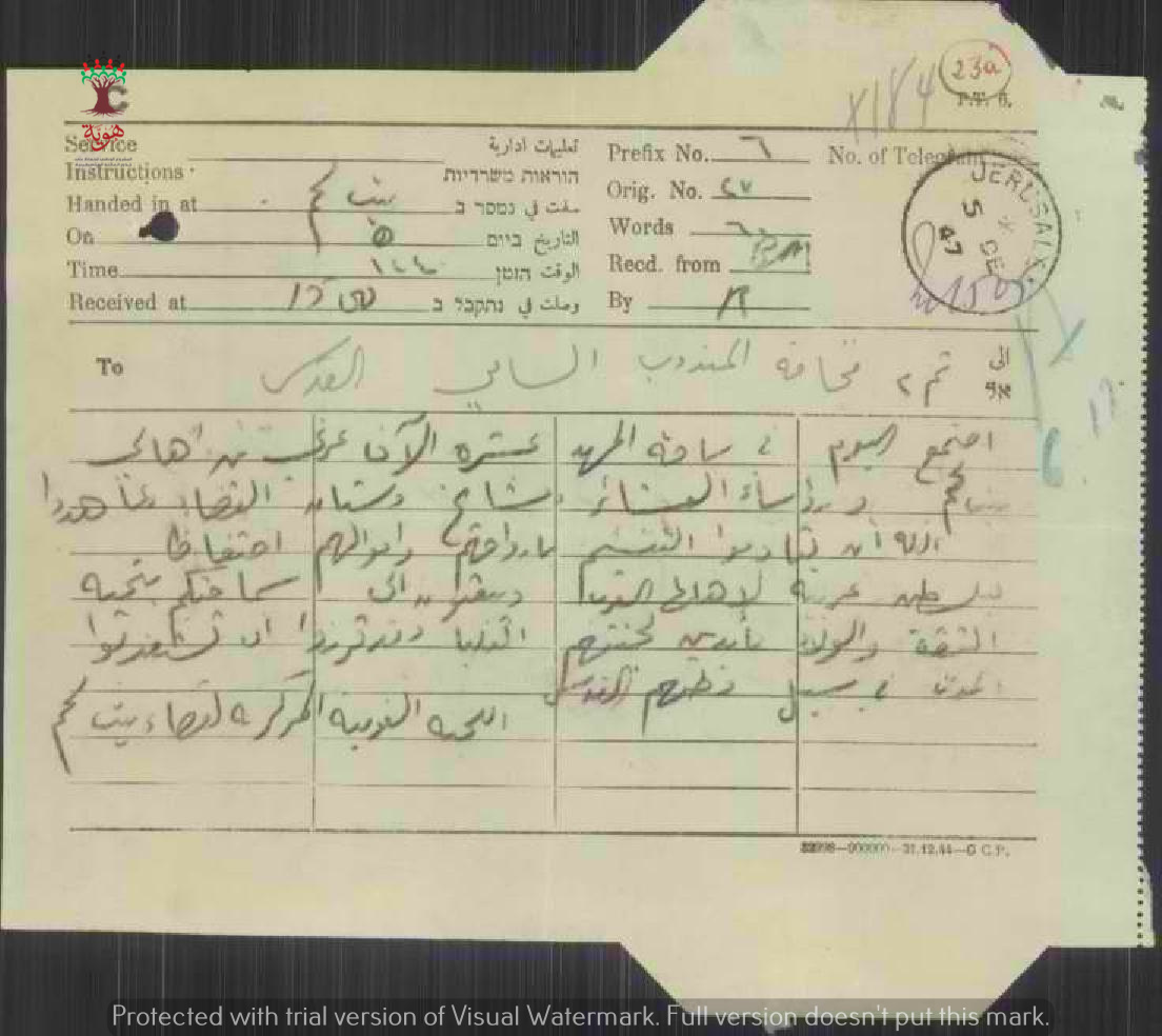 تلغراف مرسل من اللجنة القومية المركزة/بيت لحم الى المندوب السامي احتجاجا على قرار تقسيم فلسطين معبرين أن اهالي بيت لحم مستعدين لمقاومة التقسيم بأرواحهم.