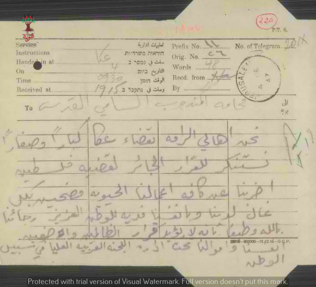 تلغراف مرسل من أهالي الرامة الى المندوب السامي احتجاجا على قرار تقسيم فلسطين
