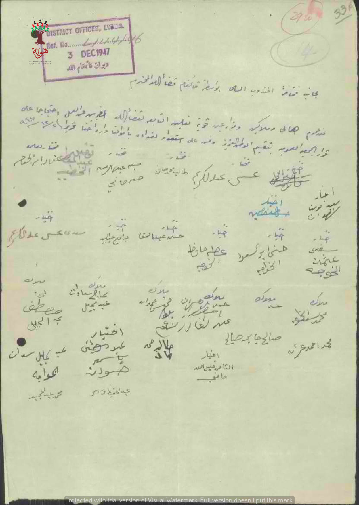 رسالة مرسلة من أهالي قرية نعلين الى المندوب السامي احتجاجا على قرار تقسيم فلسطين
