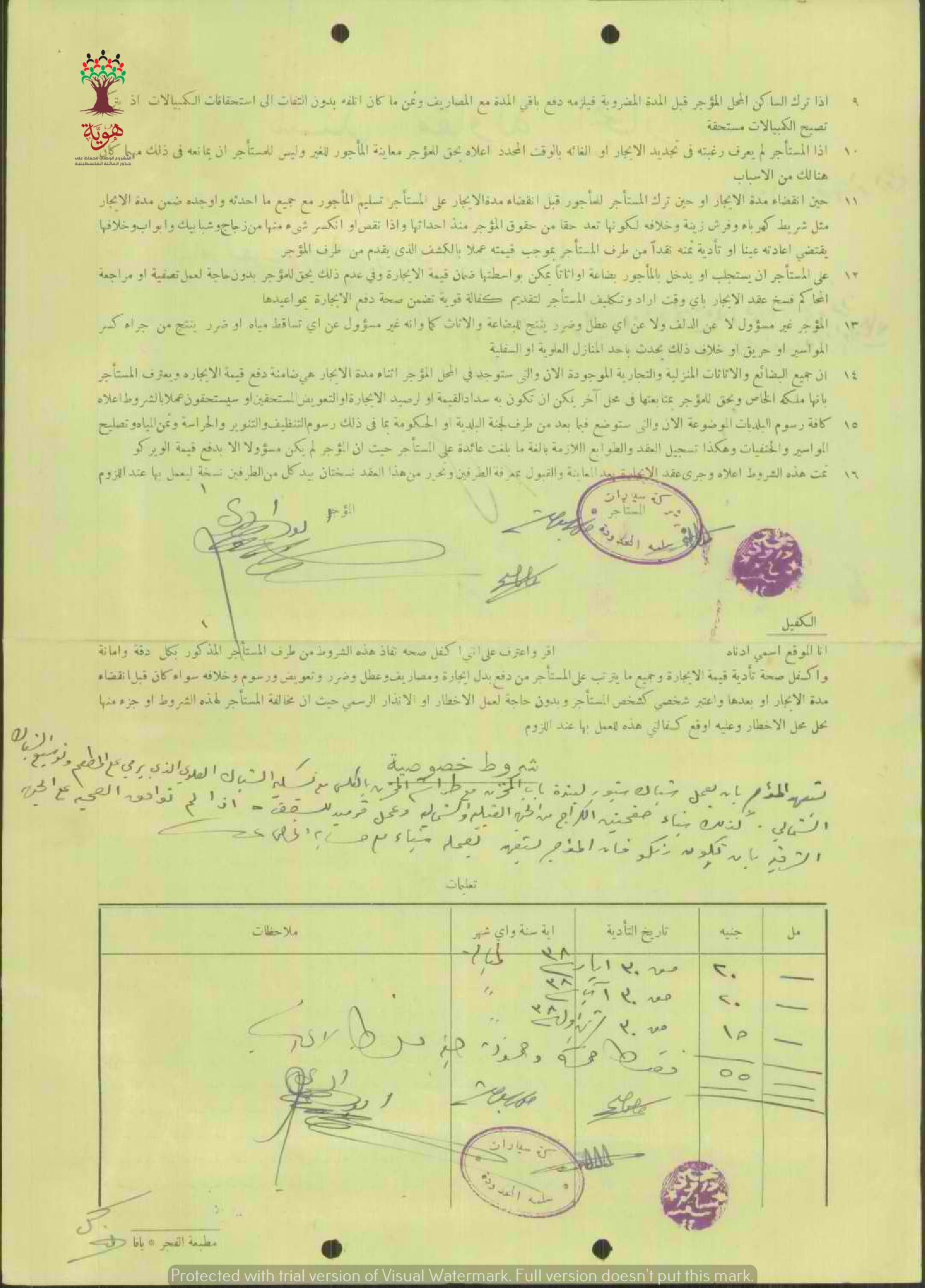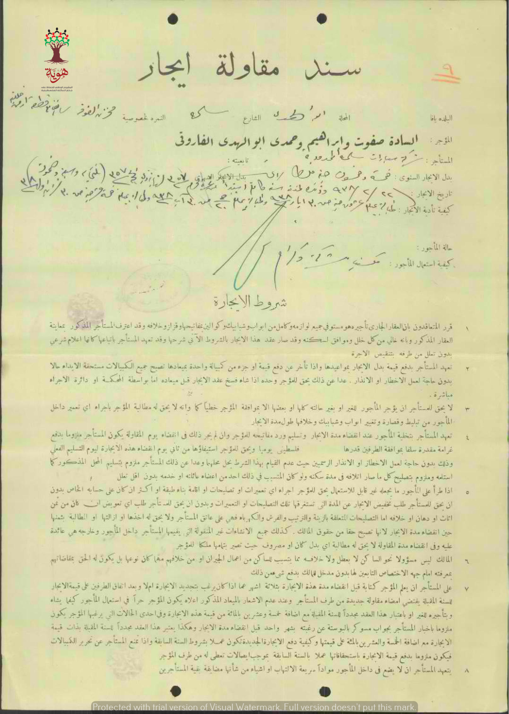 سند مقاولة إيجار ل صفوت وإبراهيم و حمدي أبو الهدى الفاروقي من شركة سيارات سلمة المحدودة يتضمن بدل الإيجار السنوي وشروط الإيجار والاستخدام وبعض التعليمات.
