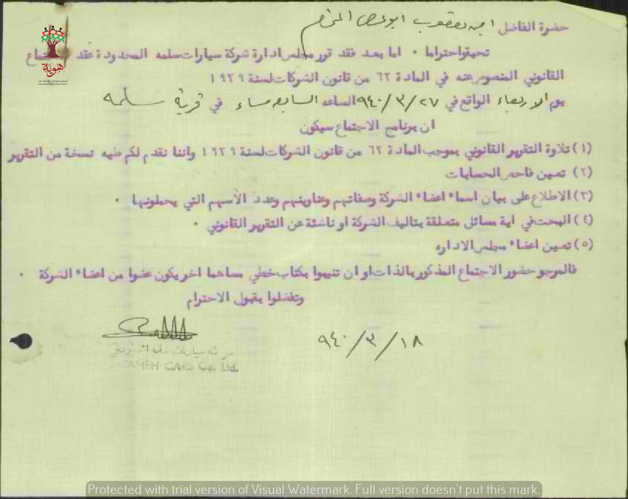 رسالة ببرنامج اجتماع شركة سيارات سلمة المحدودة ل أمين يعقوب أبو عوض