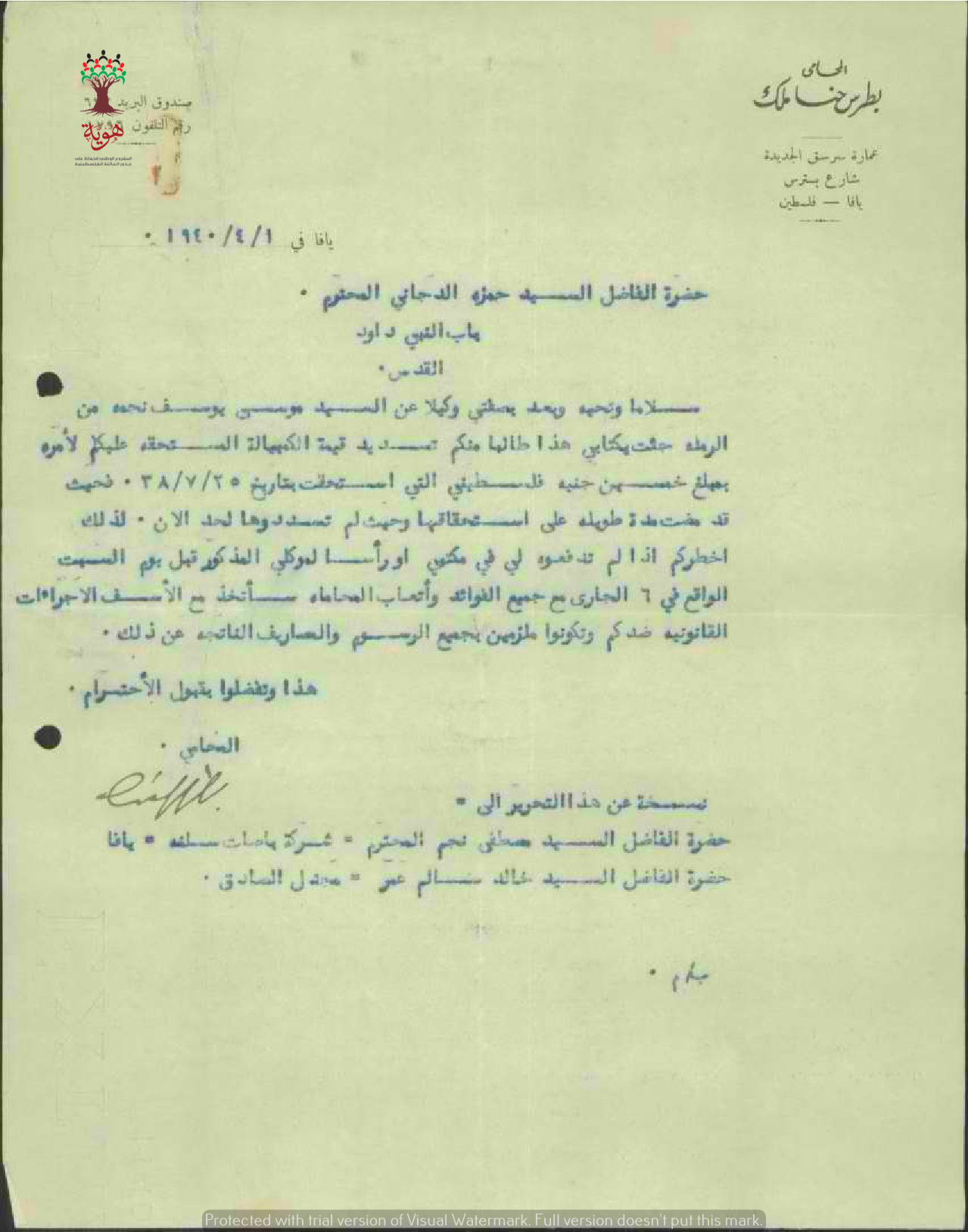 مذكرة موجهة ل حمزة الدجاني من أجل دفع كمبيالة متأخرة للسيد موسى يوسف نجمة