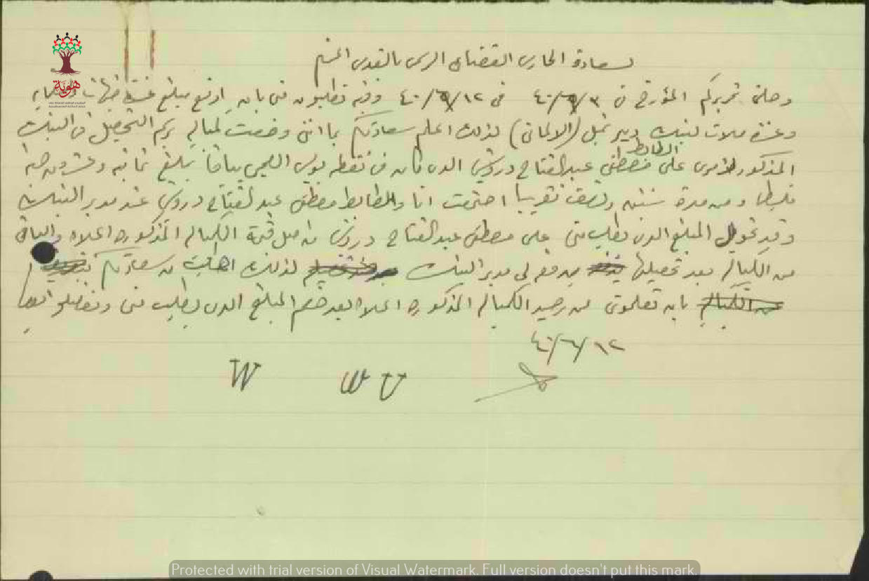 رسالة من مصطفى عبد القادر أبو نجم الى الحرس القضائي في القدس بخصوص دفع كمبيالة متأخرة ويقول بأنه دفعها للضابط مصطفى عبد الفتاح درويش.