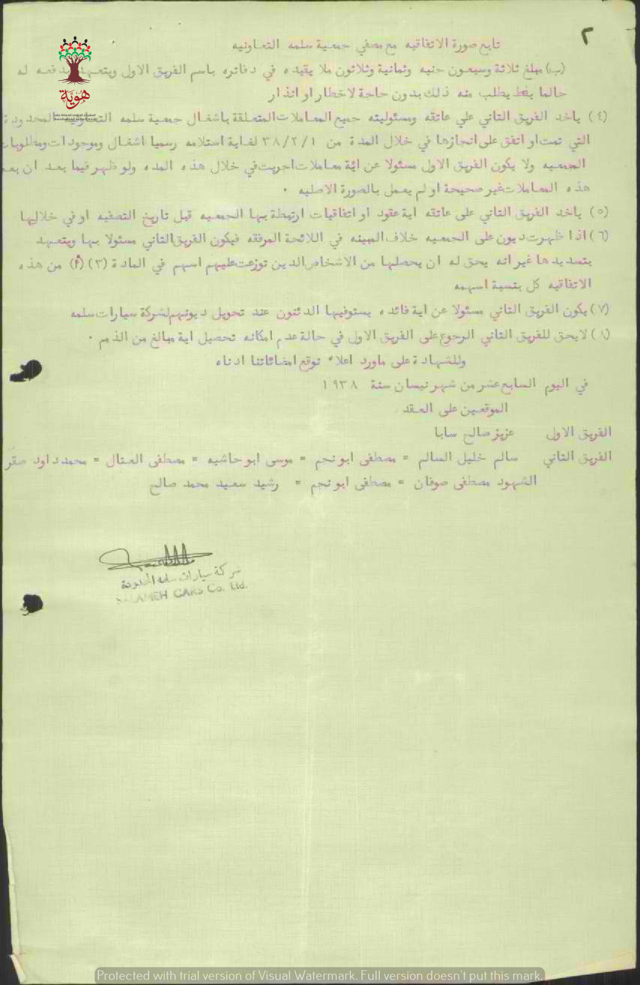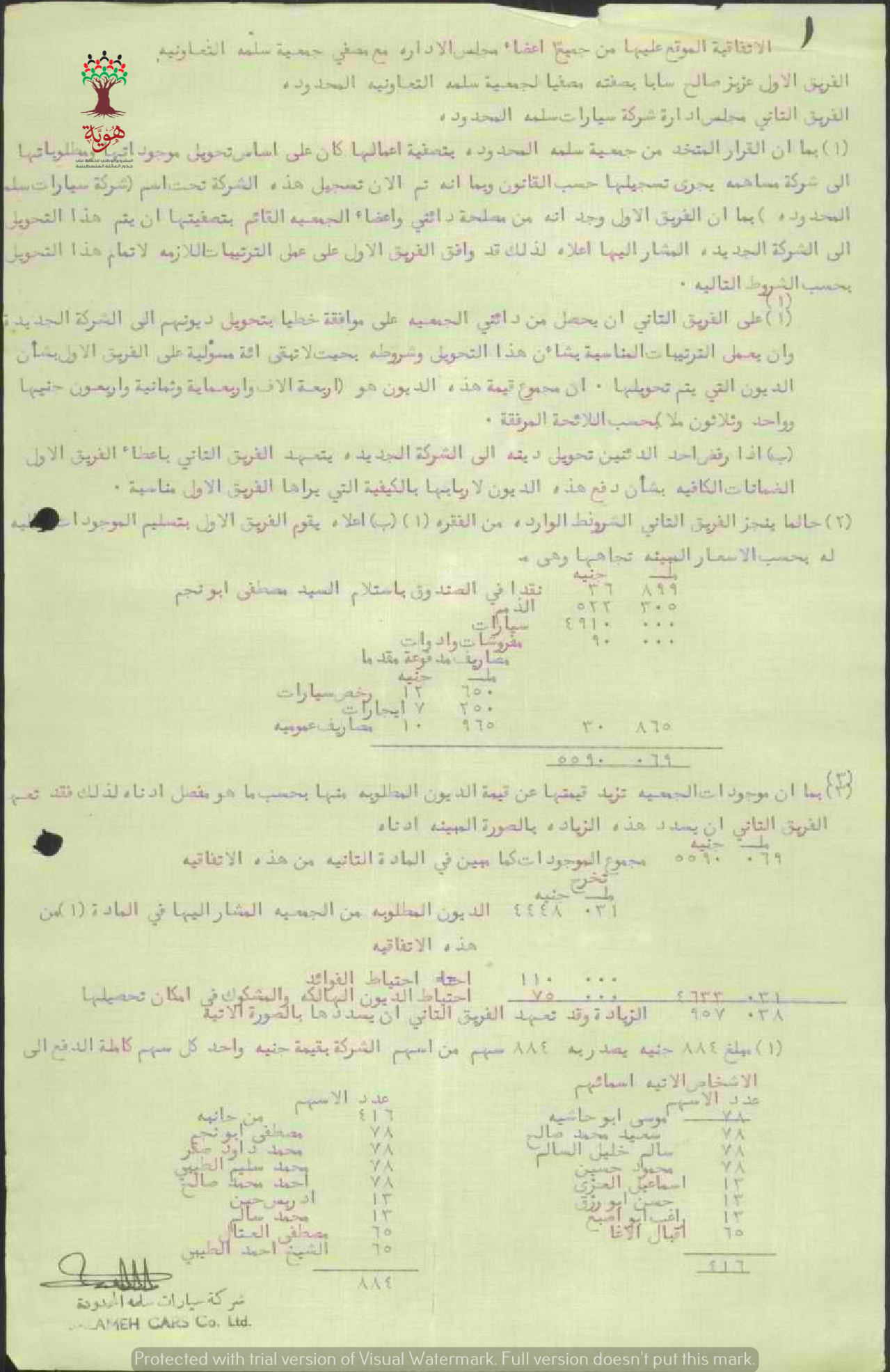 اتفاقية تصفية أعمال جمعية سلمة التعاونية وتحويل موجوداتها ومطلوباتها للشركة الجديدة وهي شركة سيارات سلمة المحدودة