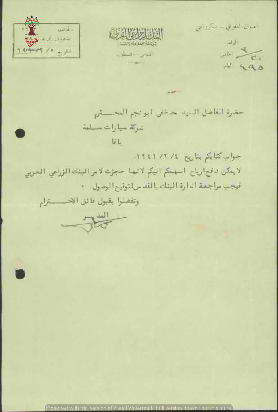 رسالة من البنك الزراعي العربي الى مصطفى أبو نجم بخصوص أرباح أسهمه