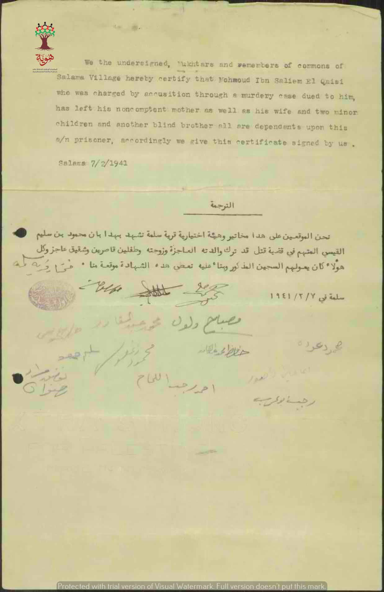 شهادة من مخاتير سلمة بأن محمود القيسي هو المسؤول والمعيل الوحيد لعائلته