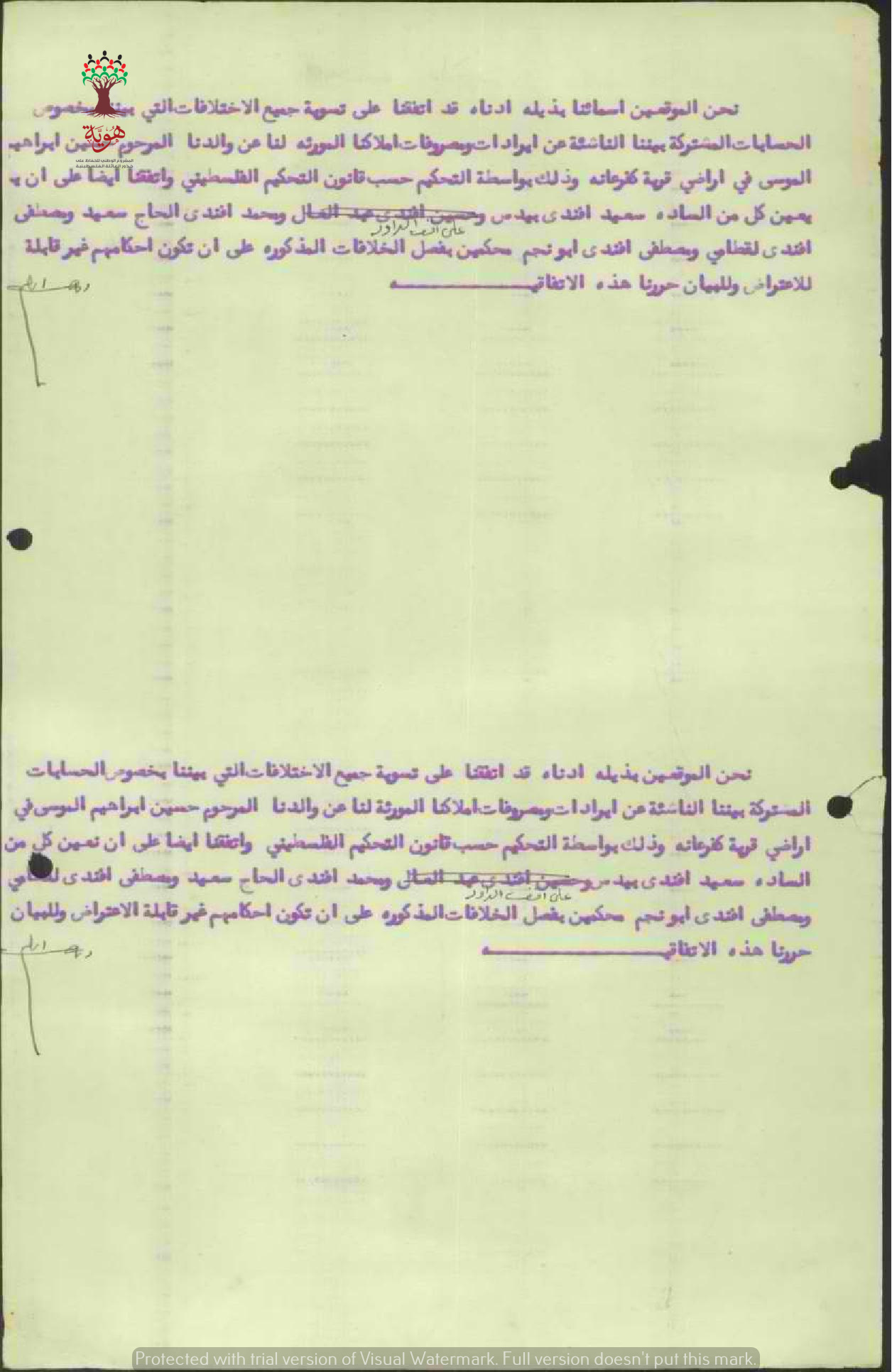 توقيع أبناء المرحوم حسين ابراهيم الموسى من قرية كفرعانة على تسوية الخلافات بينهم على خلفية الميراث.