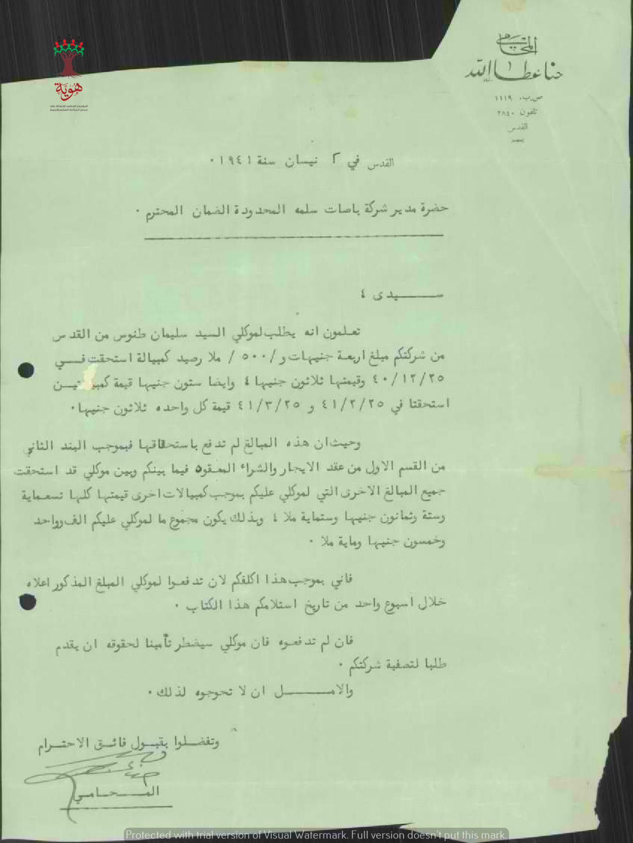 رسالة من المحامي حنا عطا الله الى مدير شركة باصات سلمة لدفع كمبيالة متأخرة لموكله سليمان طنوس