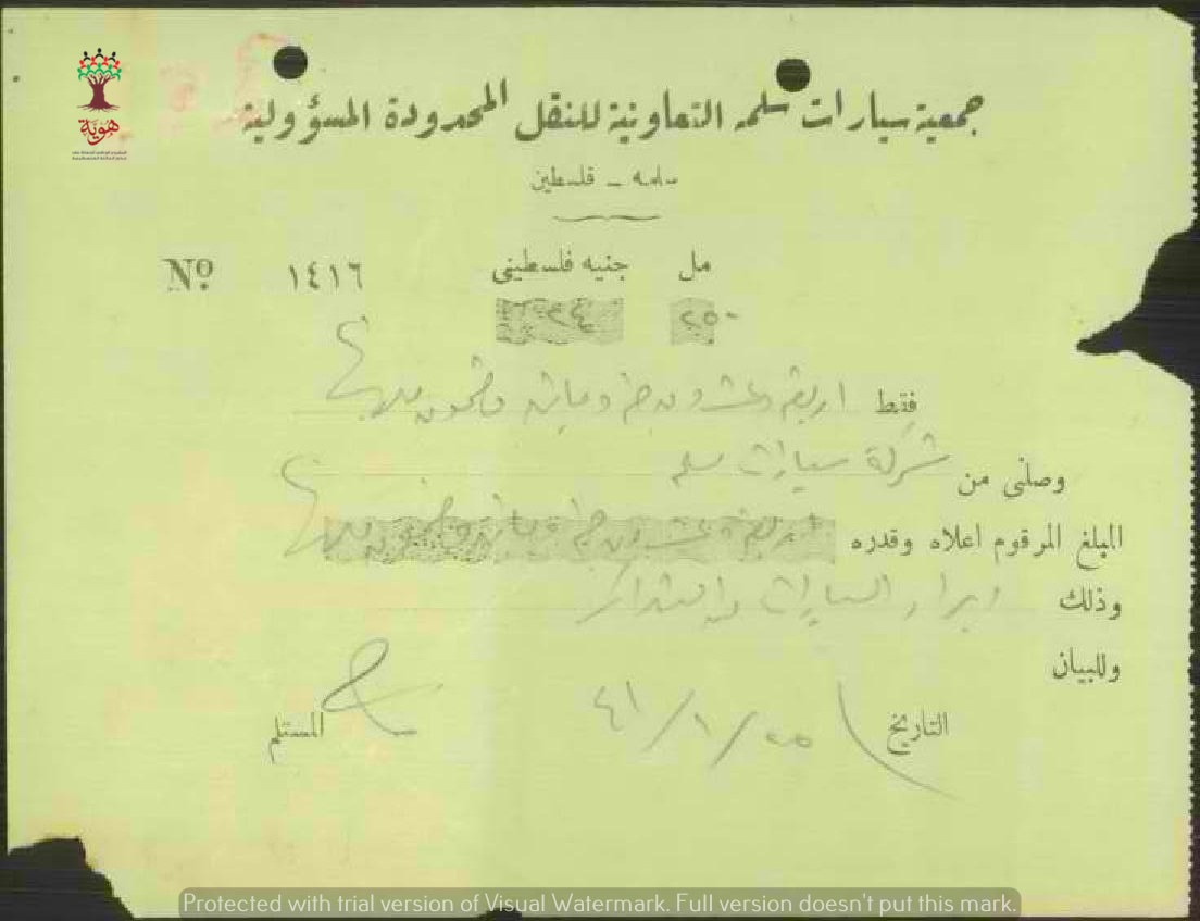 وصل دفع ايراد سيارات صادر عن جمعية سيارات سلمة التعاونية للنقل المحدودة