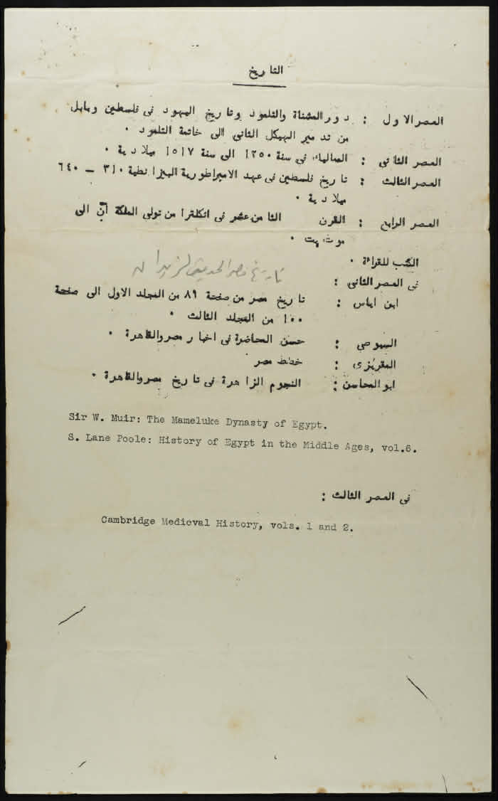 إعلان صادر عن مجلس التعليم العالي الفلسطيني خلال العشرينيات بخصوص الكتب المقررة والعصور التاريخية في منهاج التاريخ للدراسة الثانوية، وتتضمن دور المشنا والتلمود وتاريخ اليهود في فلسطين وبابل من تدمير الهيكل ثاني إلى خاتمة التلمود، المماليك في سنة 1350 إلى سنة 1517 ميلادية، تاريخ فلسطين في عهد الامبراطوية البيزنطية، القرن الثامن عشر في انجلترا، تاريخ مصر الحديث، وتاريخ العصور الوسطى.