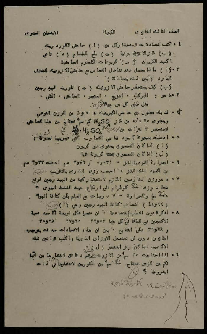 الامتحان السنوي لمادة الكيمياء للصف الثالث الثانوي، وجد في مجموعة صخر الخطيب، ويعود لأحد أفراد عائلة الخطيب الذين درسوا في الكلية العربية في القدس، خلال عشرينيات وثلاثينيات القرن العشرين.