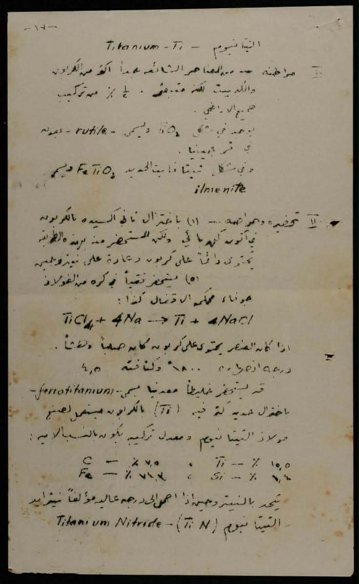 ملخص دراسي بعنوان "التيتانيوم"، وجد في مجموعة صخر الخطيب، يعود لأحد أفراد عائلة الخطيب الذين درسوا في الكلية العربية في القدس، خلال عشرينيات وثلاثينيات القرن العشرين.