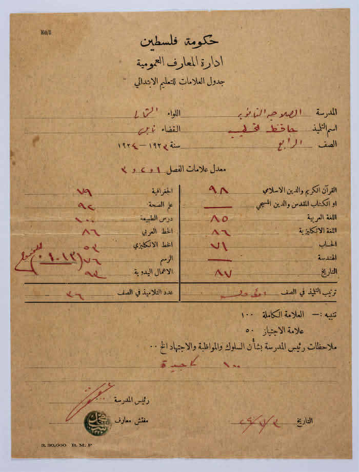 جدول العلامات الخاص بحافظ الخطيب في المرحلة الابتدائية عام 1923، والصادر عن المدرسة الصلاحية الثانوية في مدينة نابلس التابعة لدائرة المعارف العمومية في حكومة فلسطين الانتدابية.