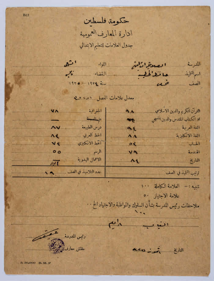 جدول العلامات للتعليم الابتدائي باسم حافظ الخطيب الصادر عن المدرسة صلاحية في مدينة نابلس التابع للواء الشمال عام 1925.