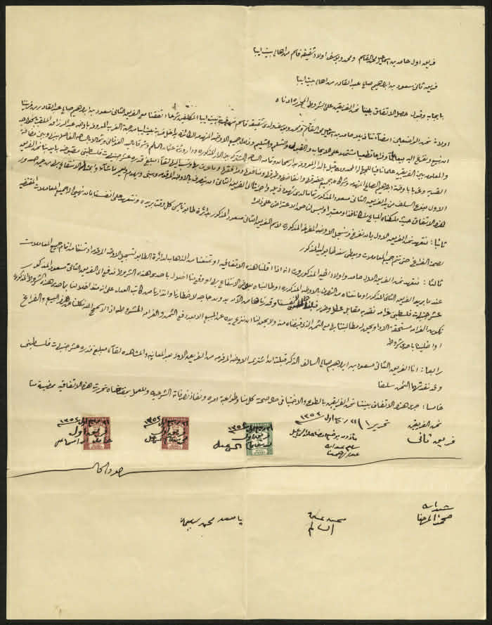 اتفاقية بيع أملاك من حامد إسماعيل القاسم ومسعود عبد القادر، تتضمن الاتفاقية تكليف الفريق الأول بتسجيل الاتفاقية في دائرة تسجيل الأراضي في نابلس مع تحمل الفريق الثاني تكاليف نقل الملكية. يظهر في نهاية الاتفاقية طوابع بريدية تحمل اسم فلسطين بثلاث لغات (الانجليزية والعربية والعبرية) مع إضافة الأحرف «الف و يود» بعد اسم فلسطين بالعبرية، وهي اختصار لـ ايريتس يسرائيل، أي ارض اسرائيل.