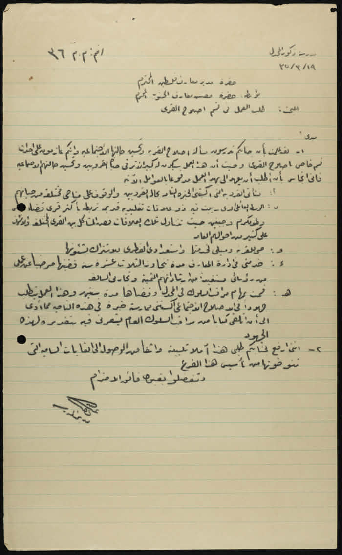 رسالة مكتوبة بخط اليد من عبدالله الخطيب إلى مدير معارف فلسطين ومفتش معارف الجنوب لطلب تعيينه في قسم إصلاح القرى، الذي كانت بدايات تأسيسه عام 1935 فترة الانتداب البريطاني. يذكر الخطيب في رسالته الخبرة التي اكتسبها في مجال الاصلاح الاجتماعي والتعامل مع أهالي القرى من خلال عمله كمراقب للسلوك العام في المجدل وقضاها لمدة سنتين ومن خلال العلاقات الذي ربطت عائلته في بيت إيبا بأكثر من قرية قضاء نابلس وطولكرم وجنين.