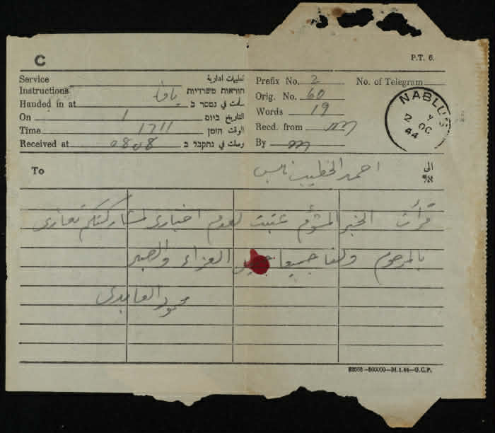 برقية مكتوبة بخط اليد من محمود العابدي إلى أحمد الخطيب لتعزيته بوفاة والده عام 1944. البرقية مُرسلة من يافا إلى نابلس بواسطة دائرة البريد والبرقيات التابعة لسلطات الانتداب البريطاني في فلسطين.