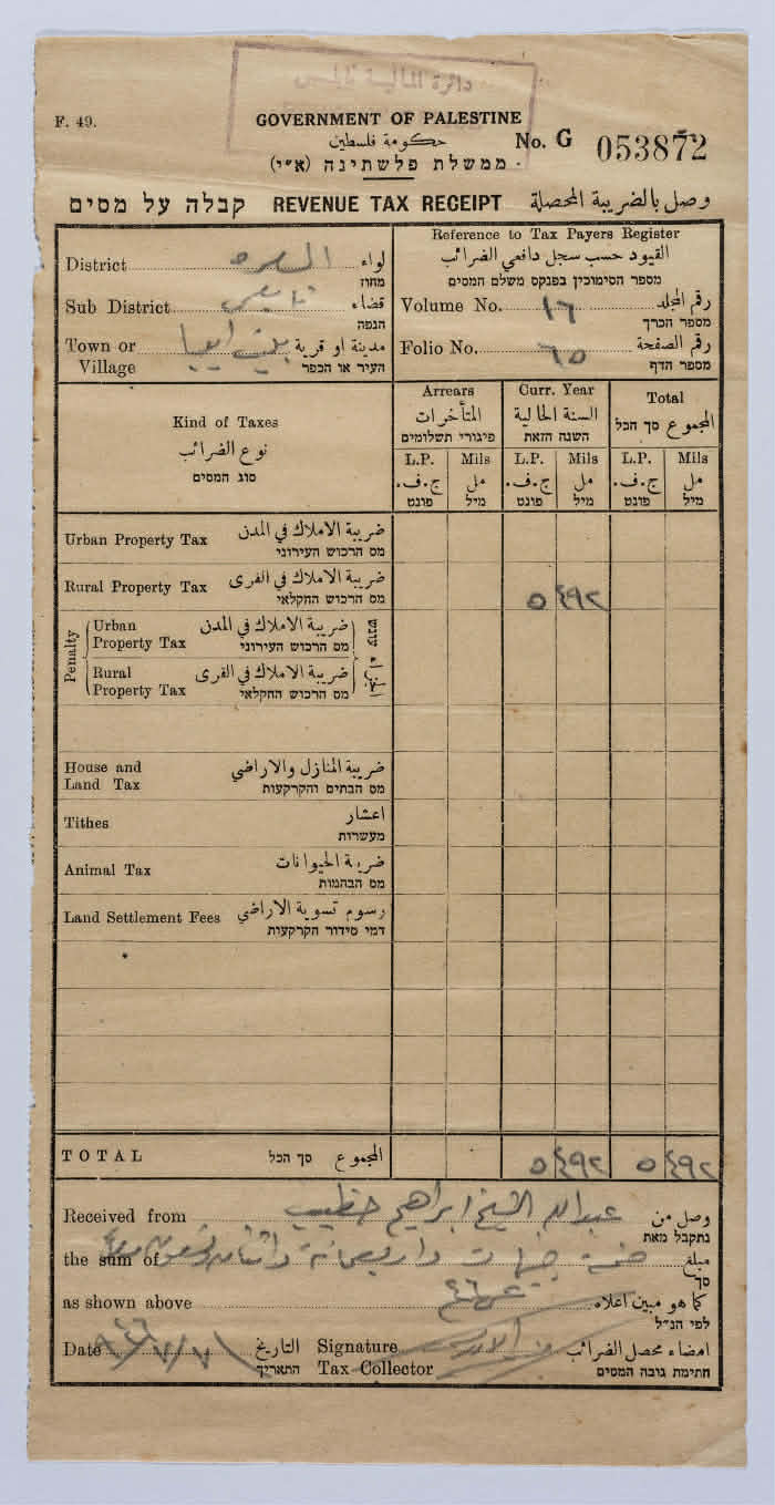 وصل ضريبي باسم عبدالله الخطيب صادر عن دائرة المالية في حكومة فلسطين الانتدابية عام 1946، الوصل مروَّس بعبارة حكومة فلسطين تليها أرض إسرائيل. يظهر في الوثيقة مجموعة أنواع من الضرائب: ضريبة أملاك في المدن والقرى، ضريبة المنازل والأراضي، أعشار، ضريبة الحيوانات، رسوم تسوية الأراضي. المصدر: أرشيف المتحف الفلسطيني الرقمي