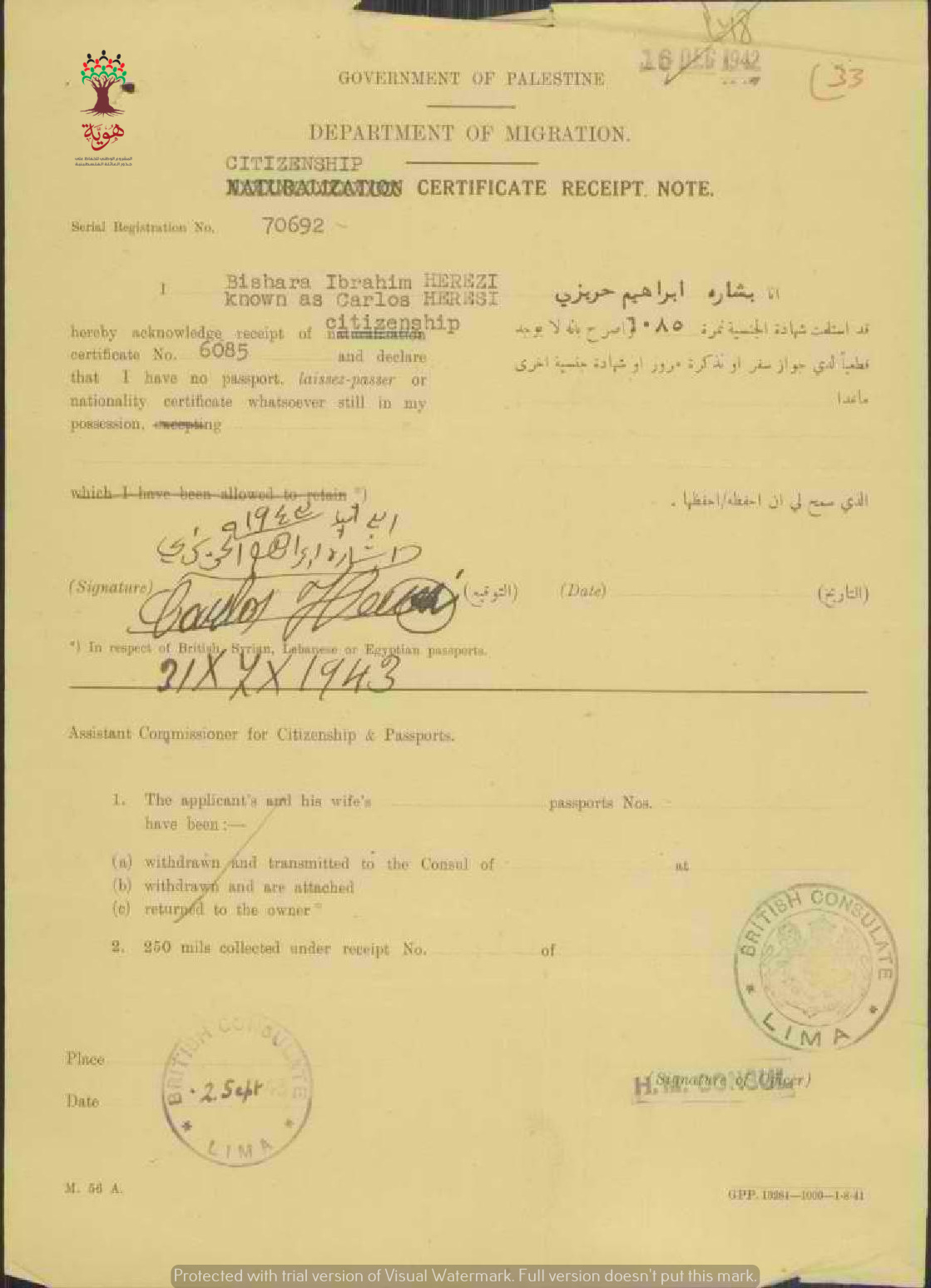 إيصال موقع من بشارة إبراهيم عيسى حريزي باستلام شهادة الجنسية الفلسطينية