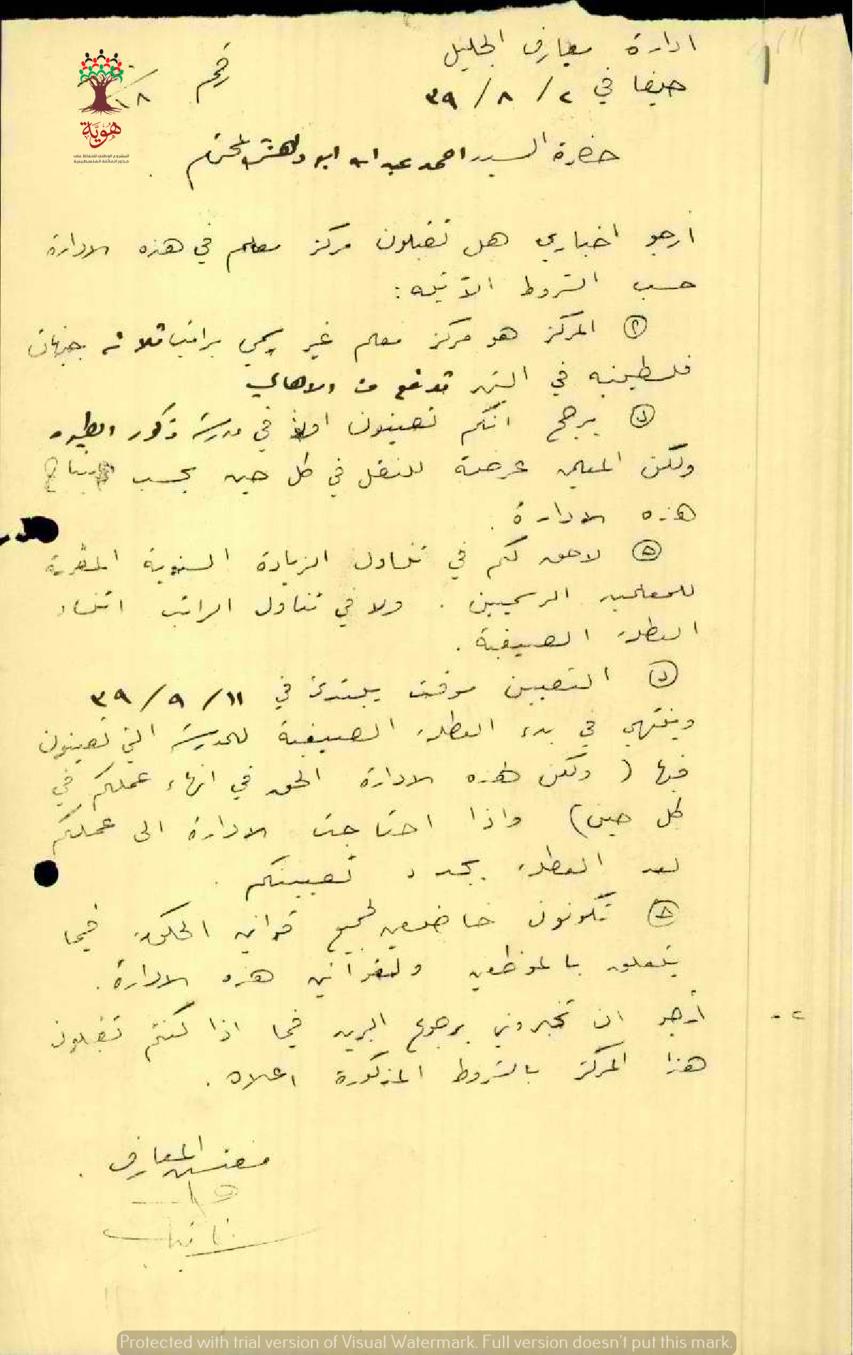 رسالة من مفتش المعارف الى المعلم أحمد عبد الله أبو داهش يعرض عليه مركز معلم غير رسمي في مدرسة الطيرة