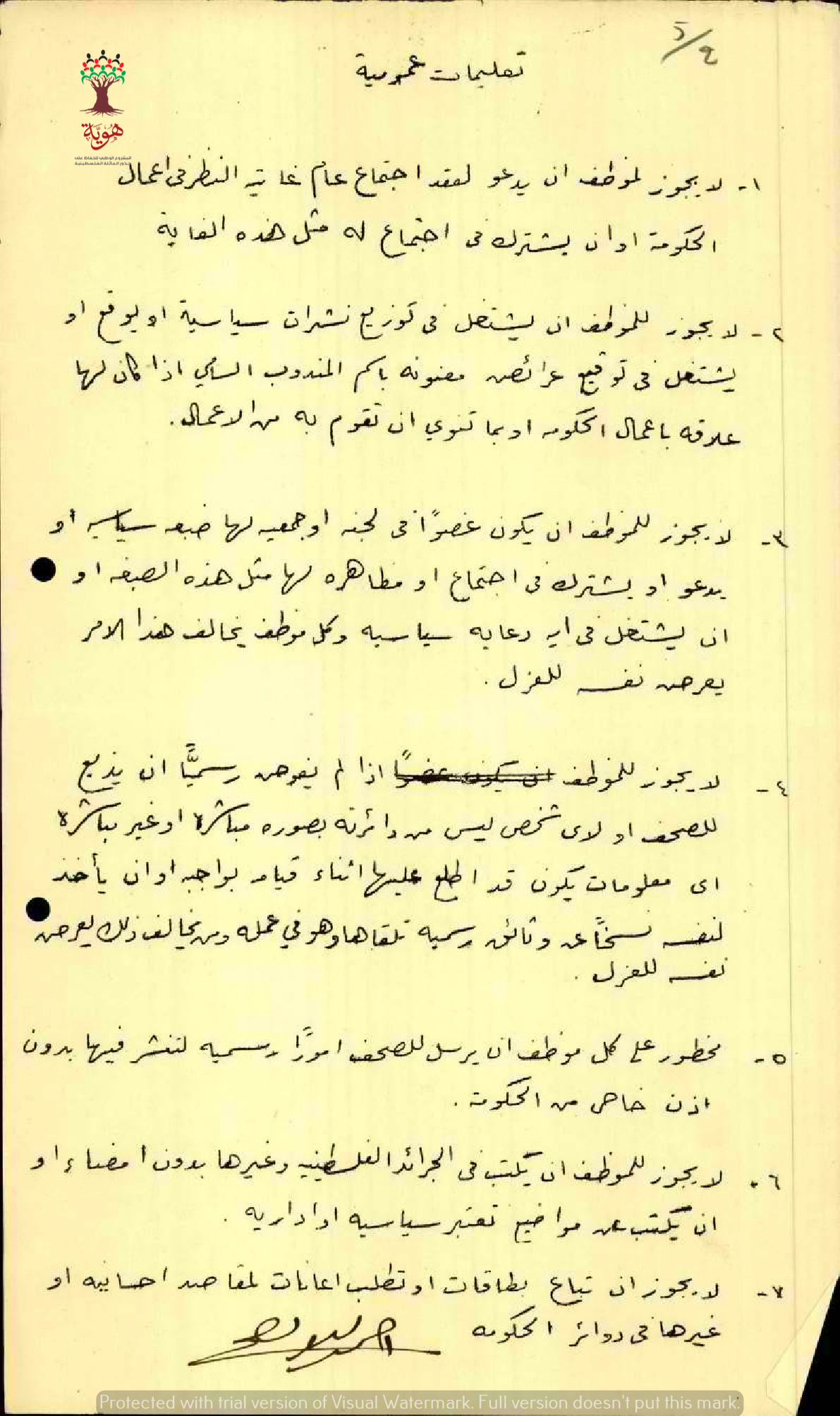 توقيع المعلم أحمد عبد الله أبو داهش على التعليمات العمومية لإدارة المعارف