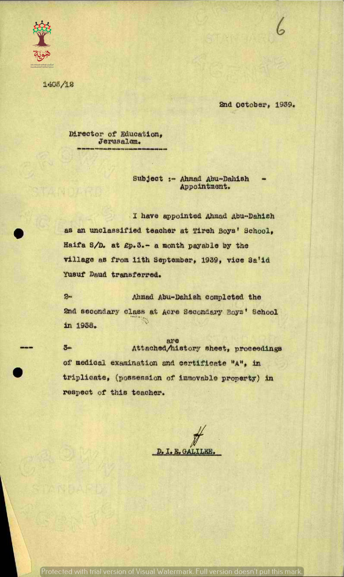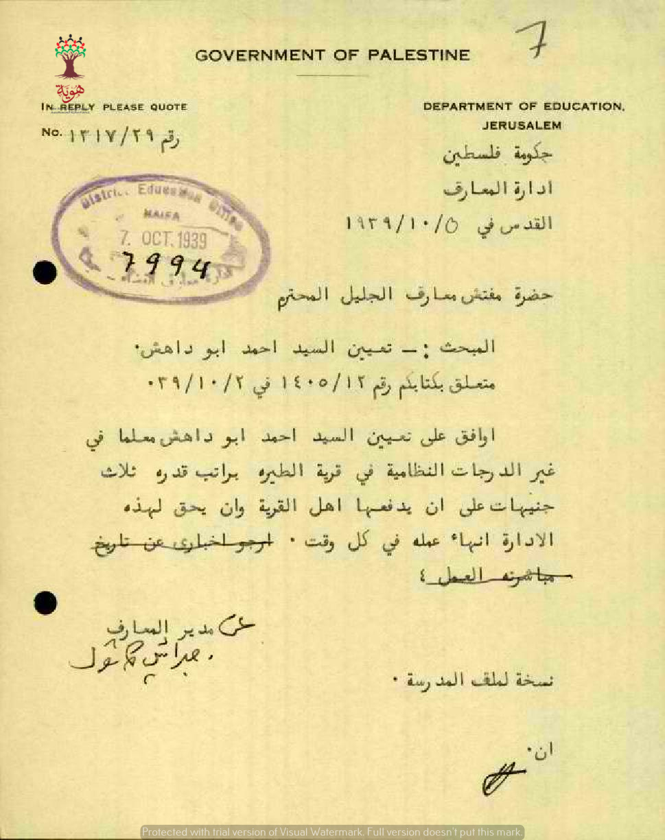 رسائل بخصوص تعيين المعلم أحمد عبد الله أبو داهش في مدرسة ذكور الطيرة