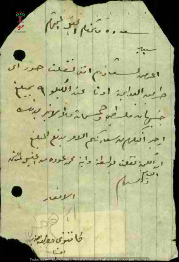 رسالة من ابراهيم حسين الى القائمقام يطلب منه دفع أجرة نقله ل صور الى طريق الدوايمة بواسطة دابة محمد عودة