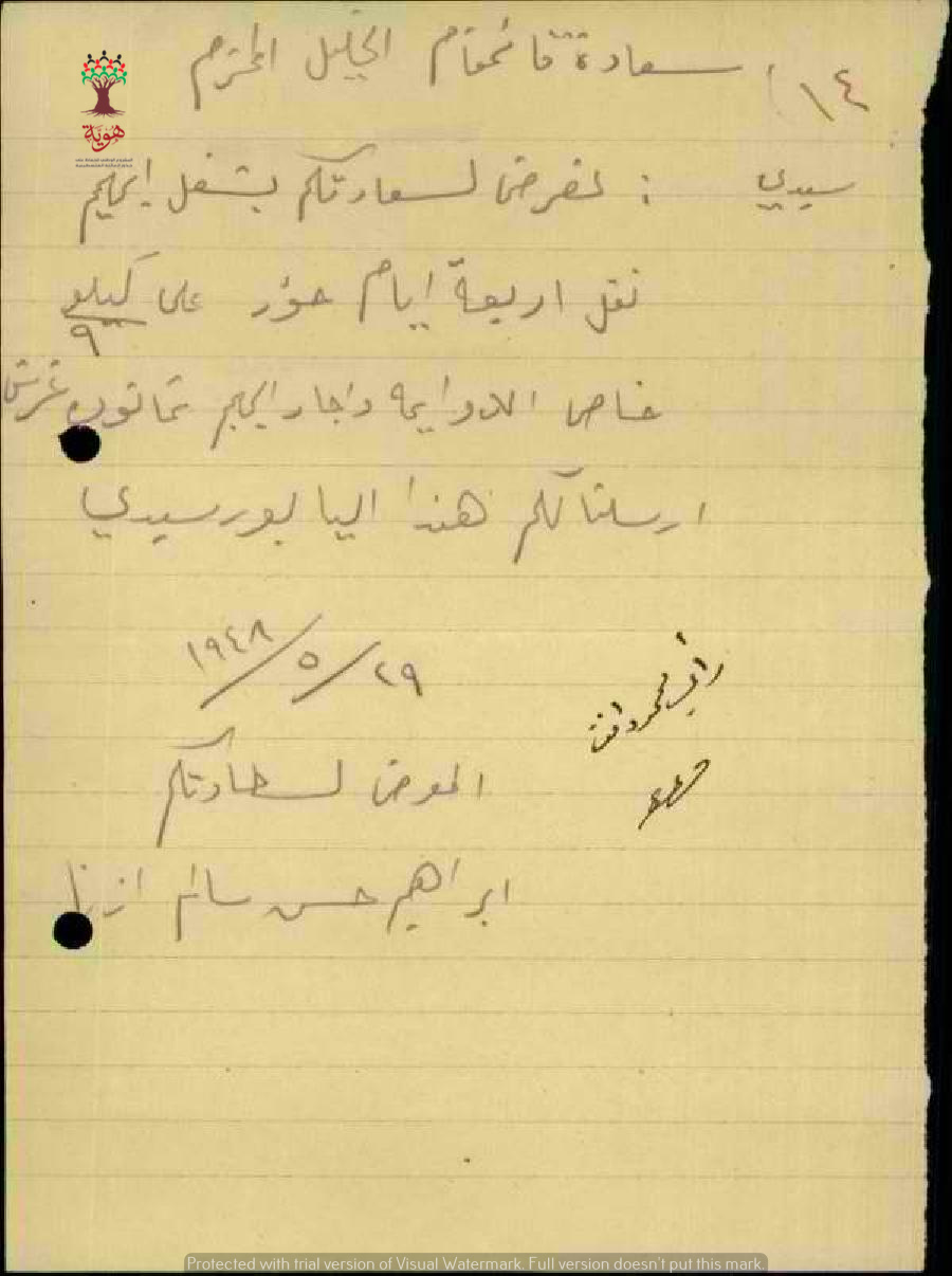 رسالة من ابراهيم حسن سالم الى القائمقام يطلب منه دفع أجرة نقله ل حوز الى طريق الدوايمة لمدة أربعة أيام