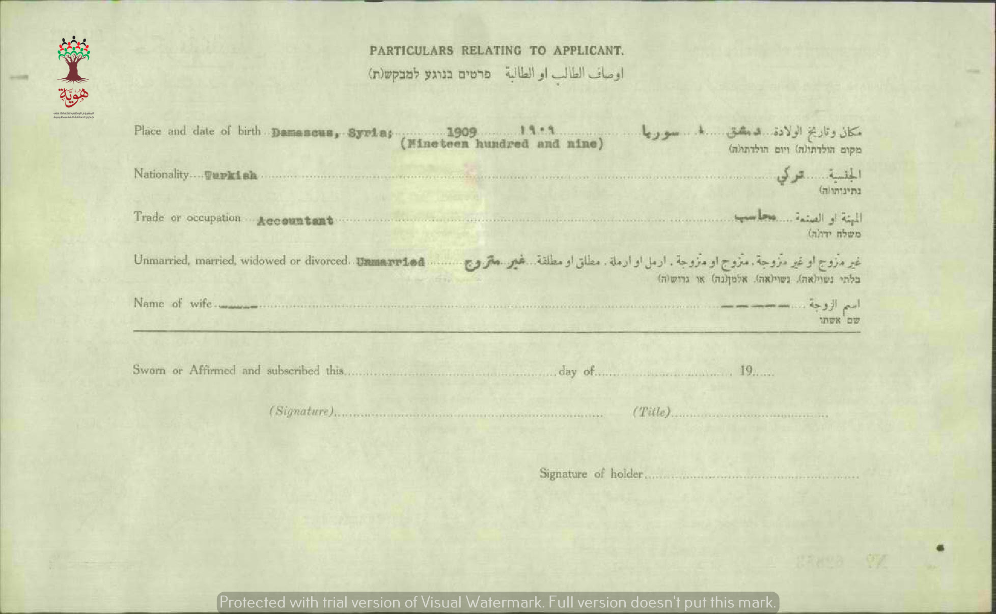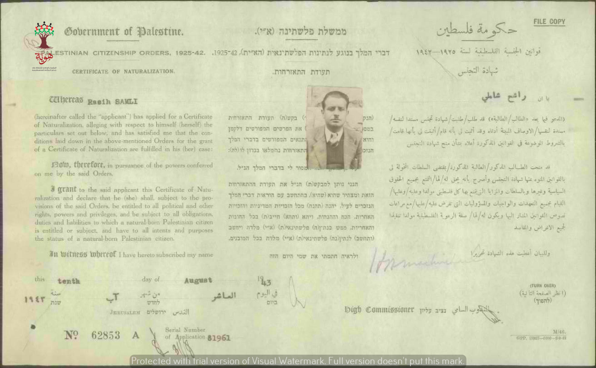 شهادة الجنسية الفلسطينية ل راشح شاملي