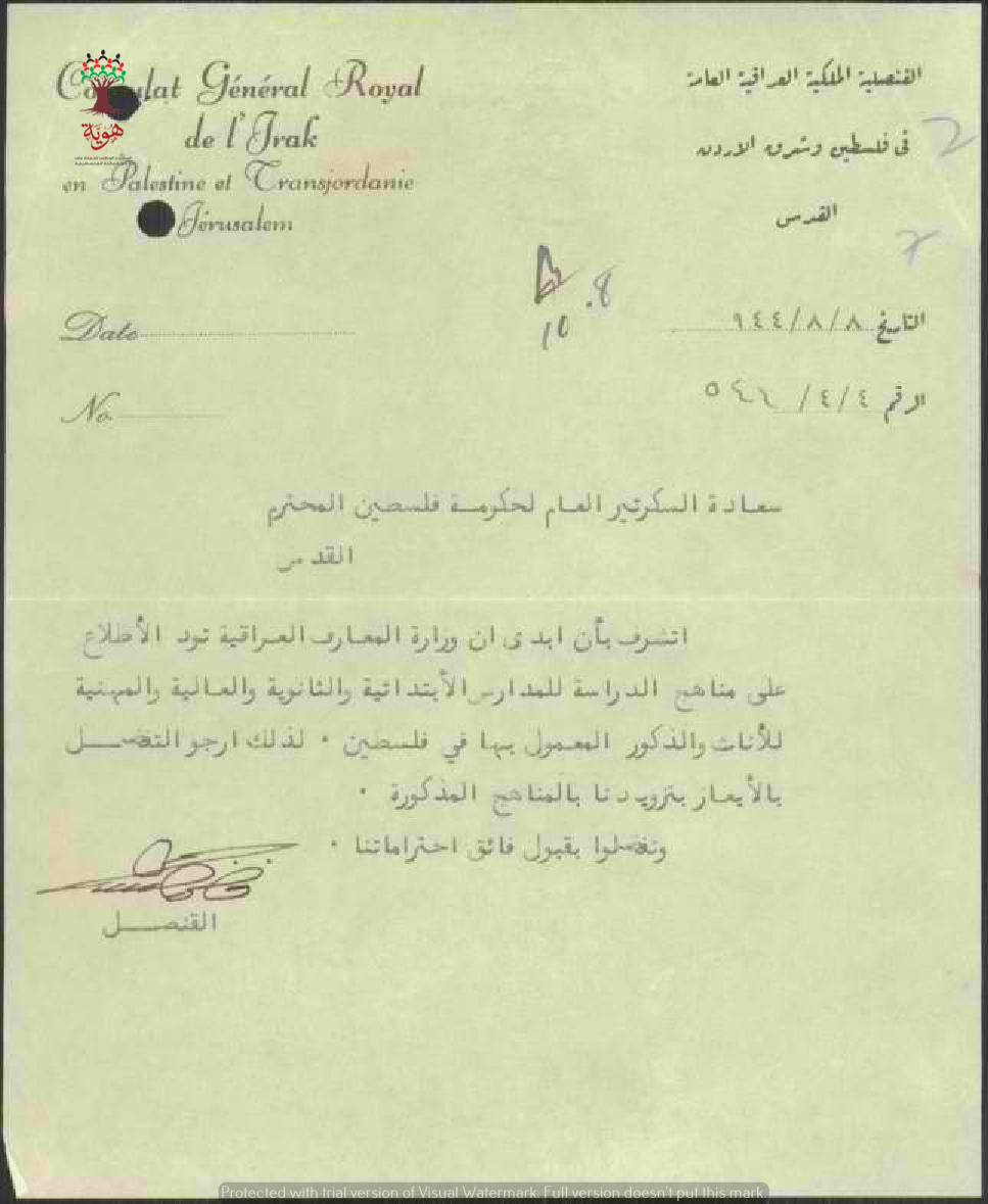رسالة من القنصل في القنصلية الملكية العراقية في فلسطين الى السكرتير العام يطلب فيها الإتطلاع على المناهج في فلسطين