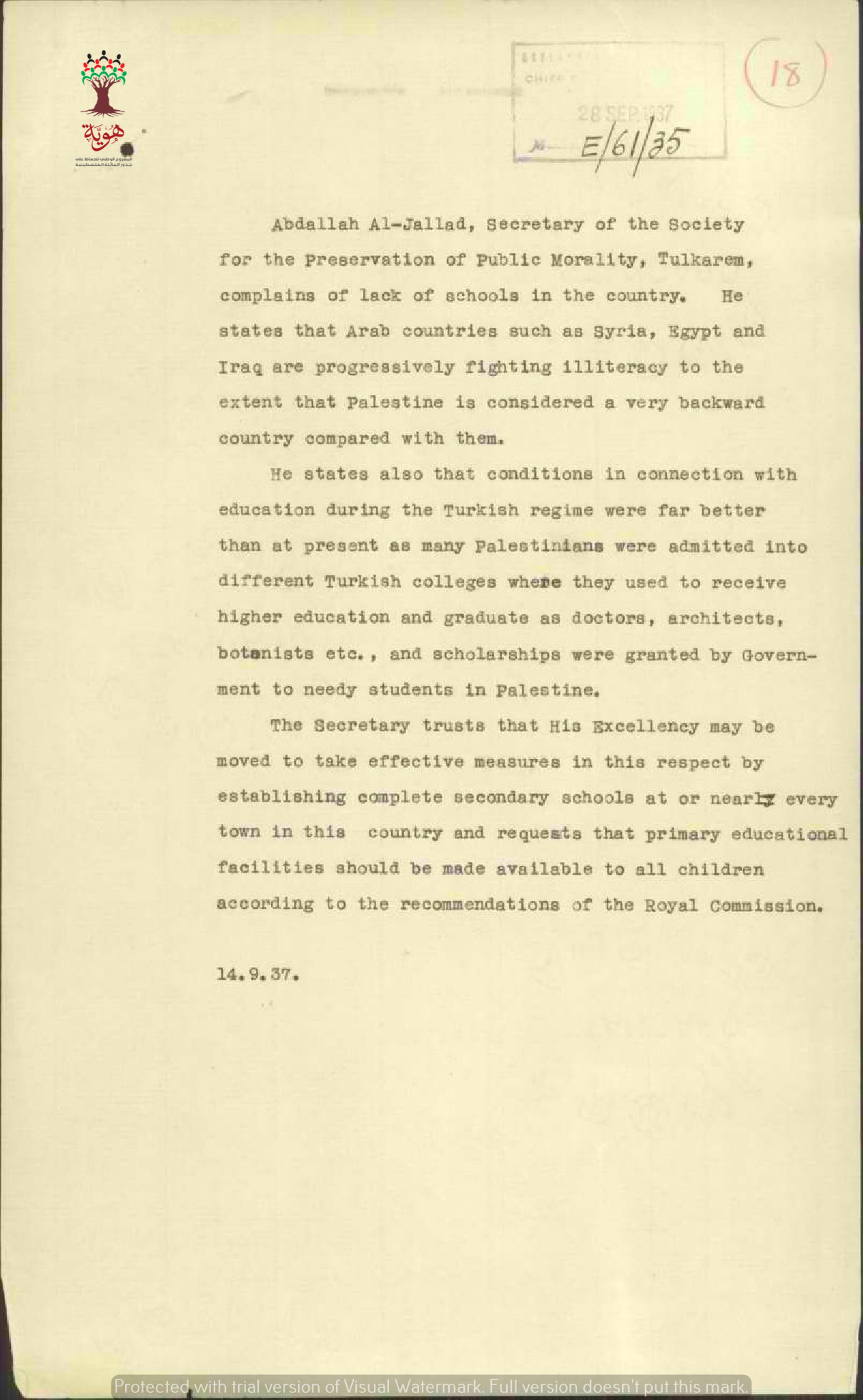 اعتراض عبد الله الجلاد سكرتير جمعية الحفاظ على الأخلاق العامة على نقص عدد المدارس في فلسطين