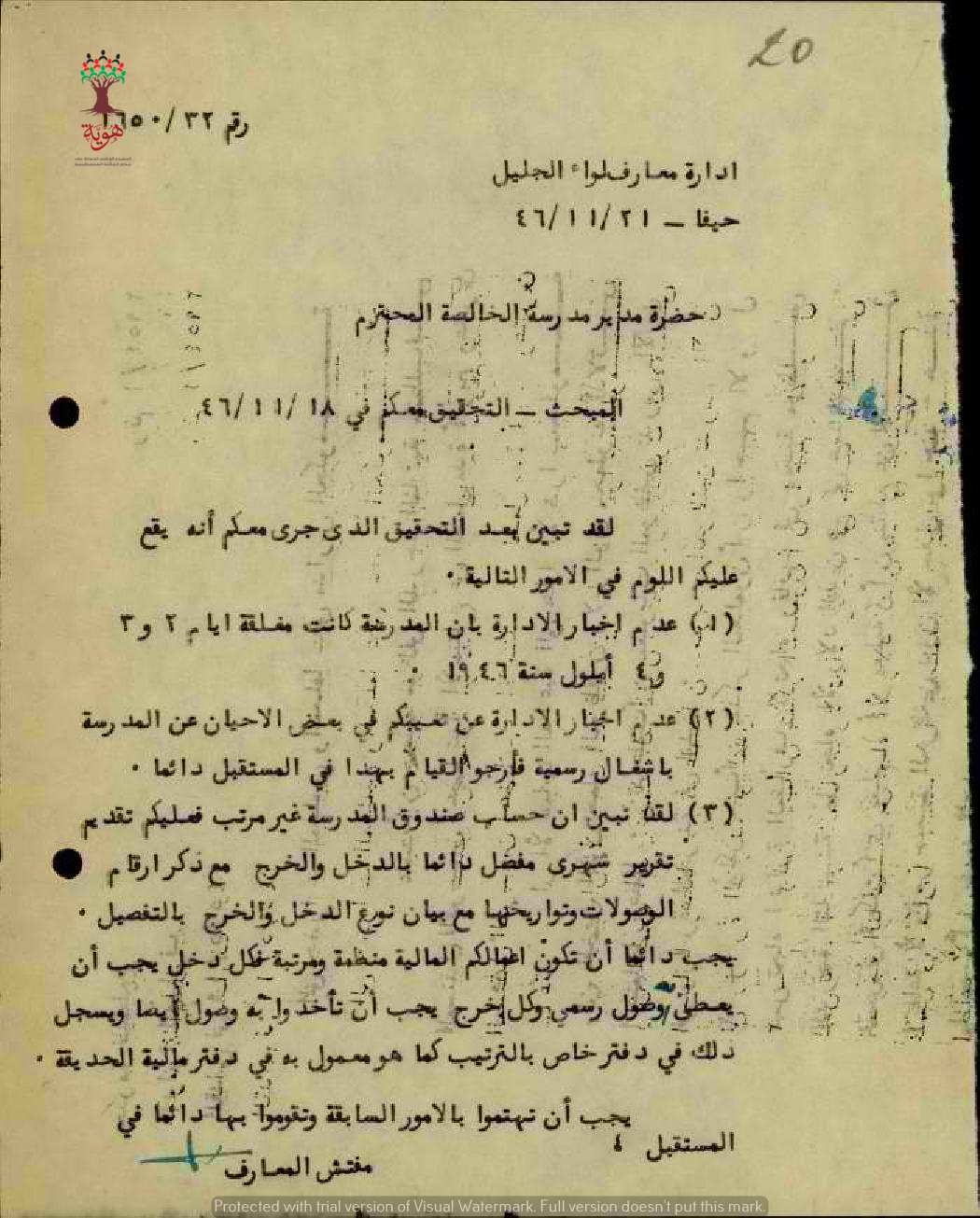 بعض الملاحظات الموجهة للمعلم كامل زغموت من إدارة المعارف بعد الانتهاء من التحقيق