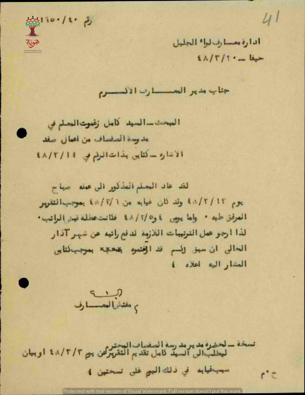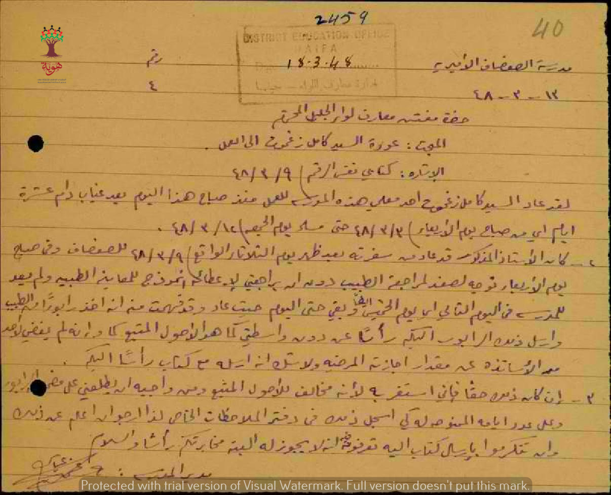مجموعة رسائل بخصوص عودة المعلم كامل زغموت للعمل في مدرسة الصفصاف