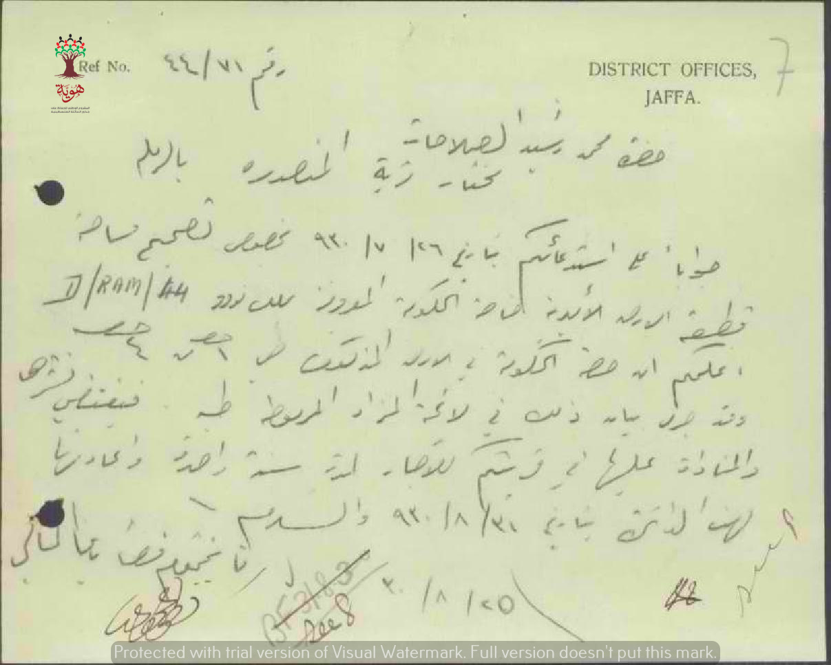 رسالة من قائمقام الرملة الى مختار المنصورة محمد رشيد الصلاحات بخصوص تصحيح مساحة أرض الوقف الخيري