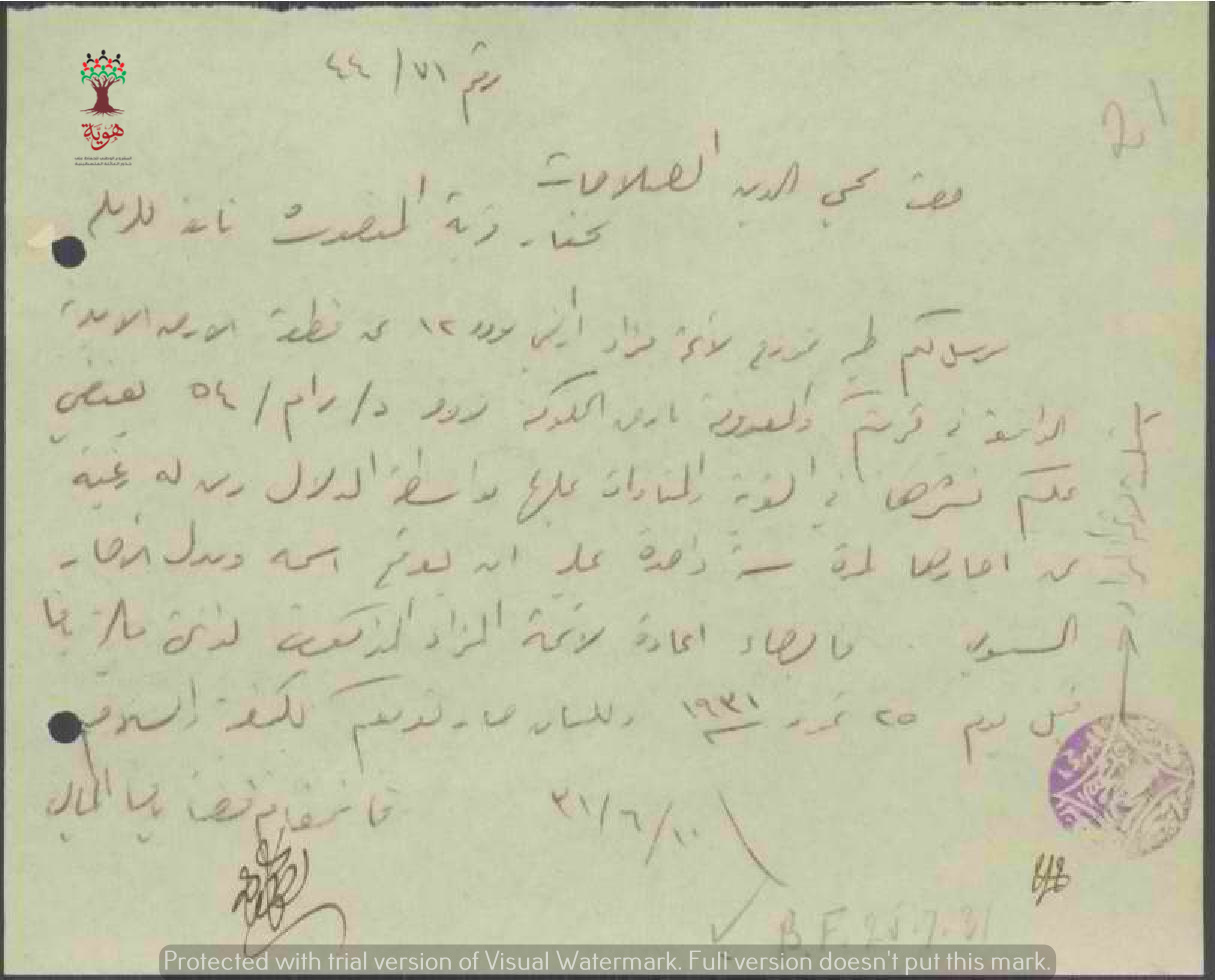 رسالة من قائمقام قضاء يافا الى مختار المنصورة محي الدين صلاحات لنشر برنامج مزاد أرض الوقف الخيري في القرية