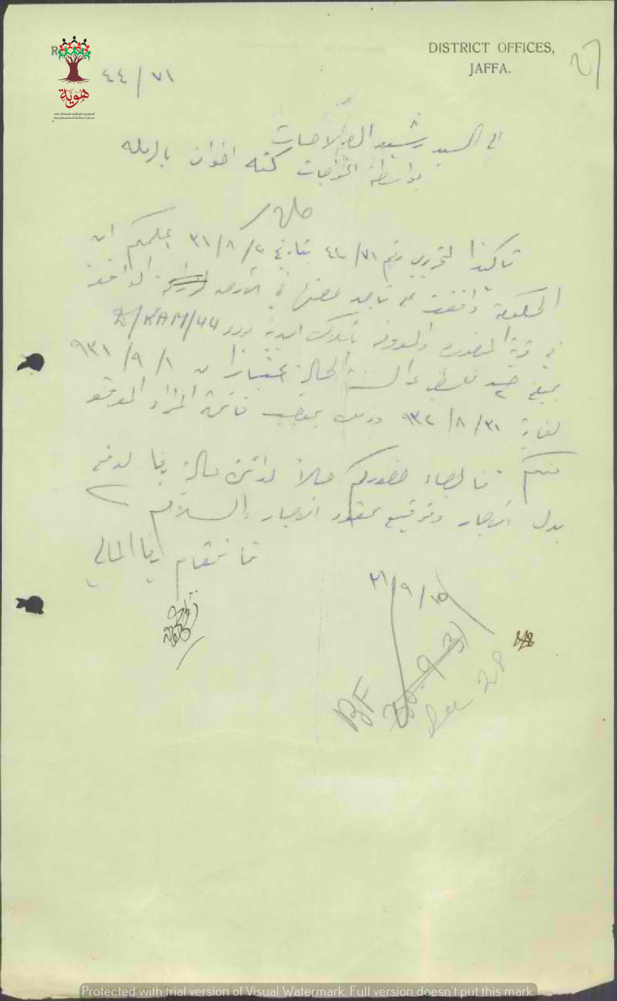 رسالة من قائمقام يافا المالي الى رشيد الصلاحات للتوقيع على عقود إيجار أرض الوقف في القرية