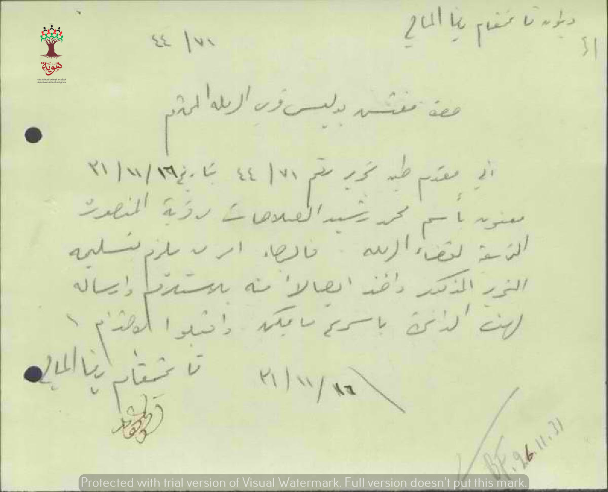 رسالة من قائمقام يافا المالي الى رئيس البوليس لاستلام إيصال إيجار أرض الوقف من محمد الصلاحات
