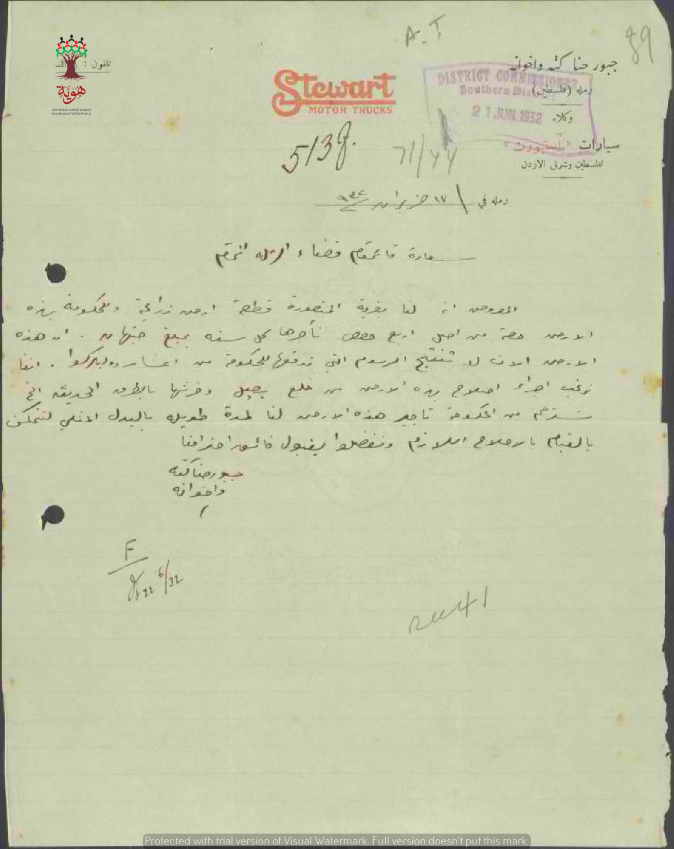 رسالة من جبور حنا الكتة الى قائمقام قضاء الرملة بخصوص حصتهم في أرض الوقف في المنصورة