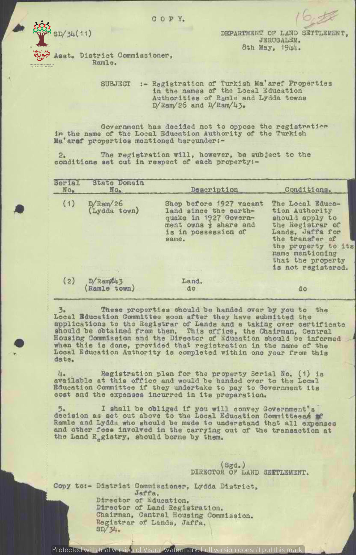 رسالة من مدير تسوية الأراضي الى مساعد حاكم اللواء بالرملة بشروط تسجيل أملاك المعارف التركية بإسم سلطة المعارف المحلية في اللد والرملة.
