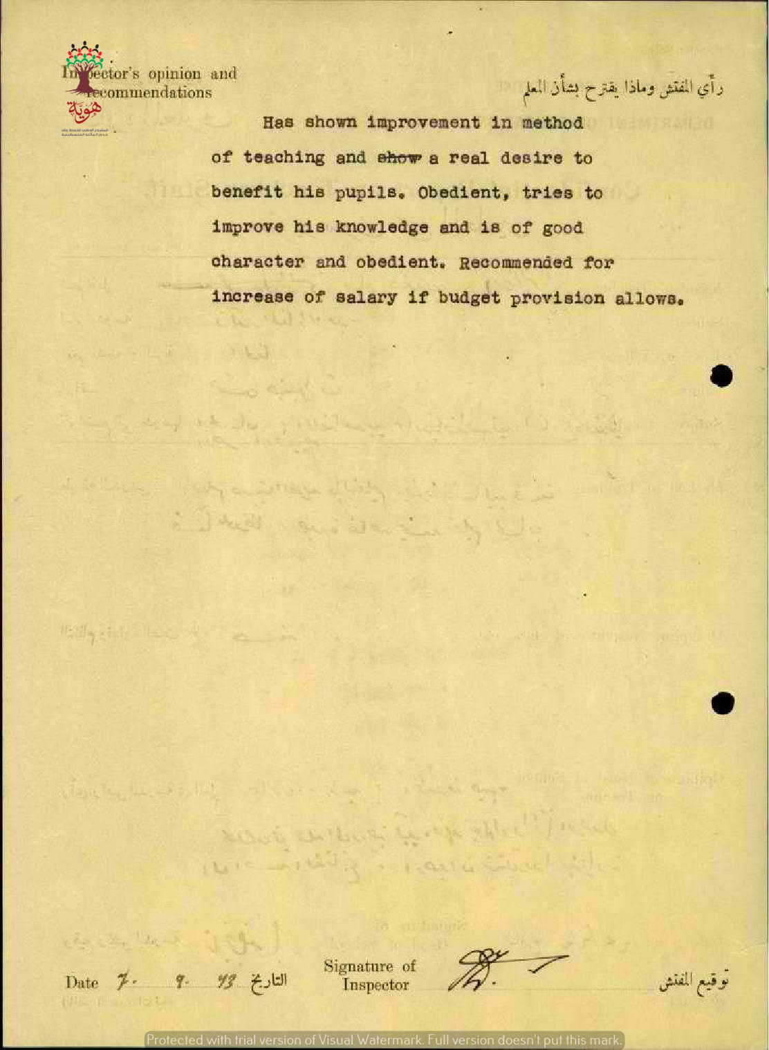 تقرير تفصيلي عن أداء المعلم جابر زريق في مدرسة المغار الأميرية سنة 1943