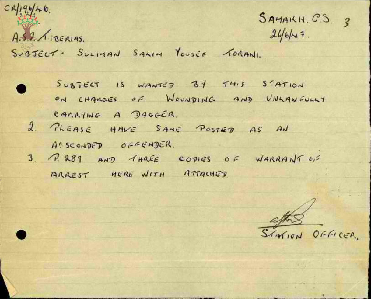 رسالة من ضابط شرطة في سمخ يصدر مذكرة اعتقال بحق سليمان الترعاني بتهمة الجرح وحمل خنجر بشكل غير قانوني