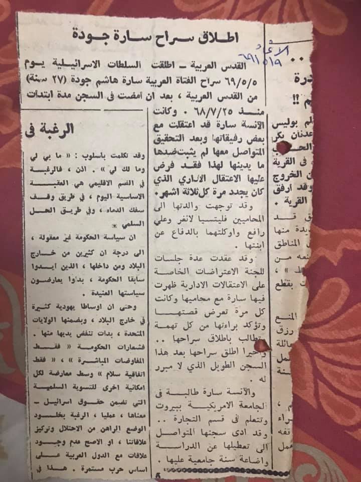 جريدة الاتحاد - اطلاق سراح سارة هاشم جودة بتاريخ 5/5/1969 بعد اعتقال إداري قرابة 10 أشهر