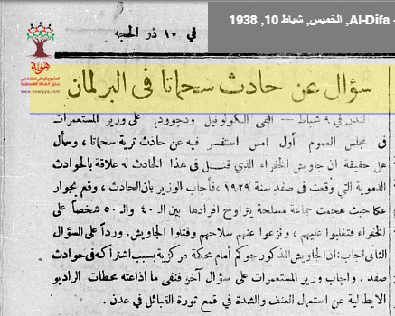 سؤال عن أحداث سحماتا 1938 في البرلمان البريطاني - جريدة الدفاع، عقب اعتداءات الجيش البريطاني على البلدة بسبب قتل جاويش