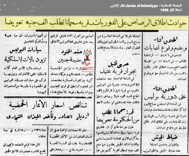 سحماتا تطلب تعويض الف جنيه بسبب عمليات التخريب - جريدة الجامعة الإسلامية 1938