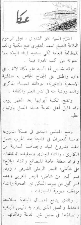 عفو الشقيري يفتح مكتبة والده للمطالعة بحسب خبر في جريدة المنتدى 1/8/1943