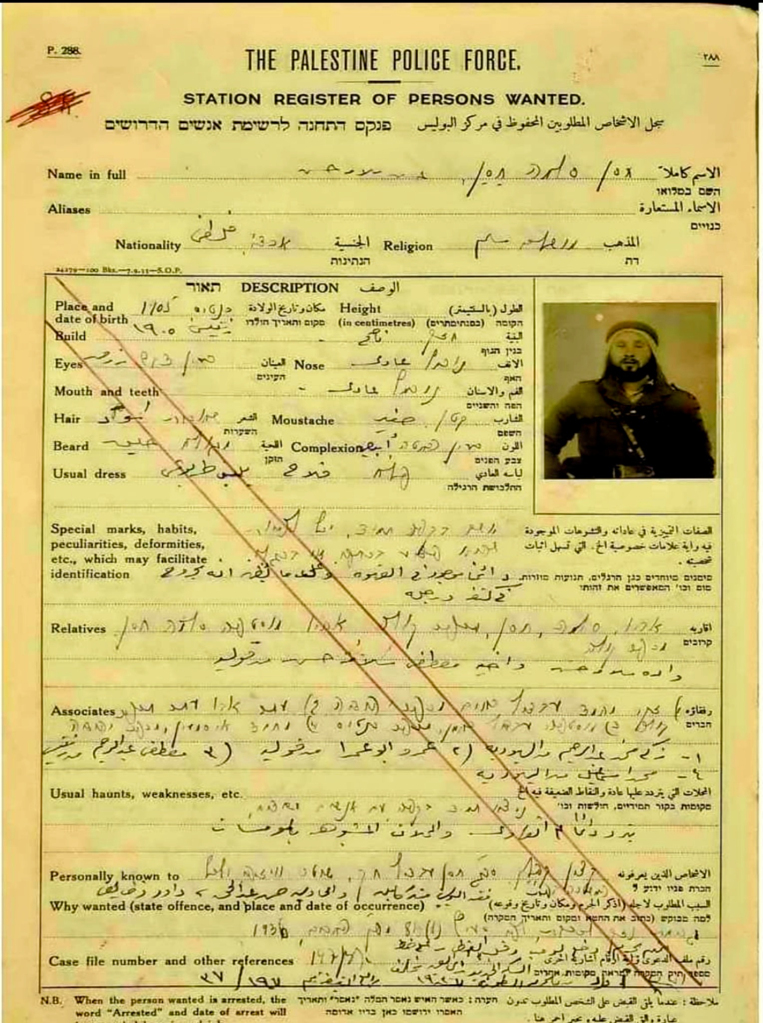 وثيقة توضح أن الشهيد حسن سلامة كان مطلوباً لسلطات الانتداب