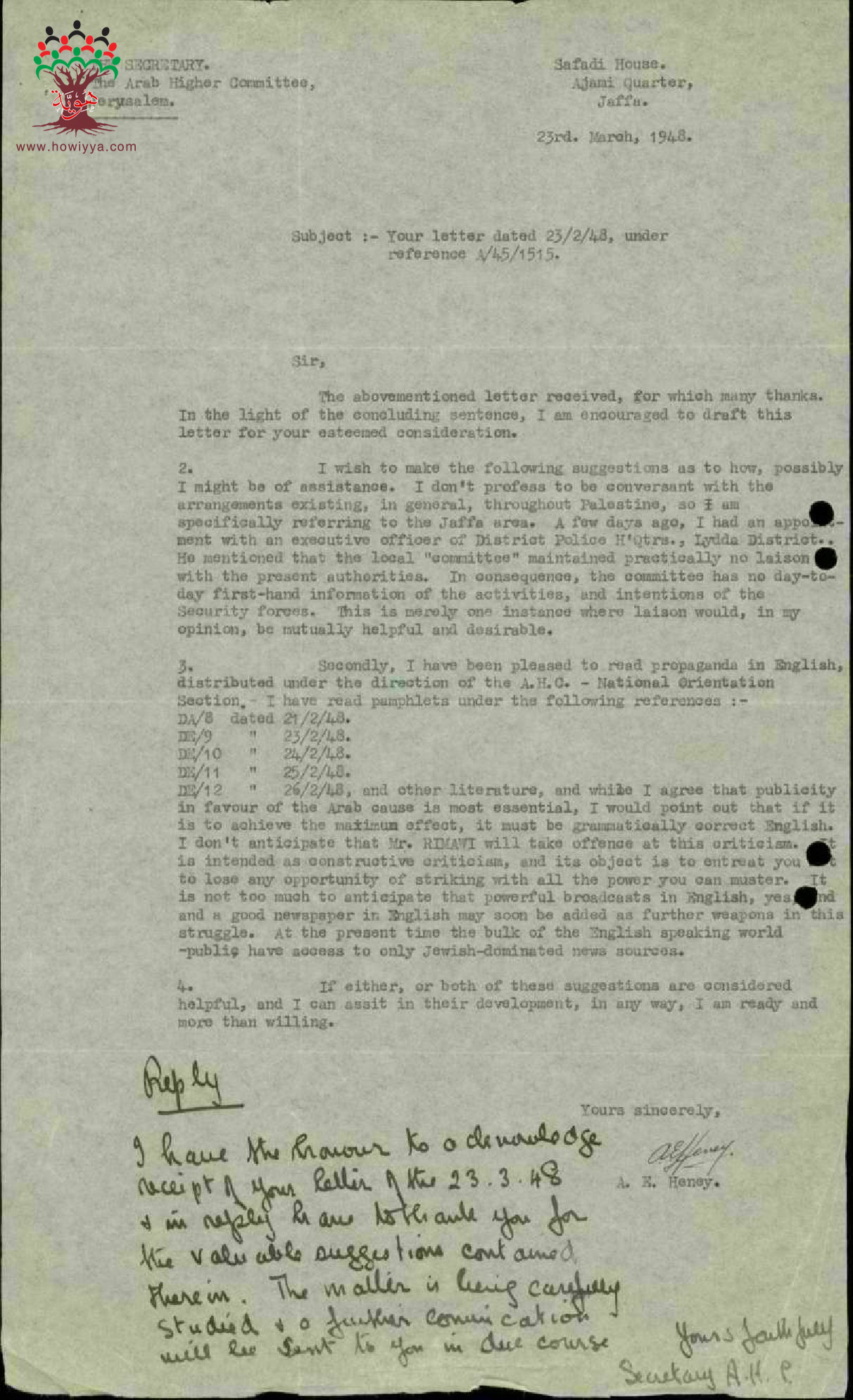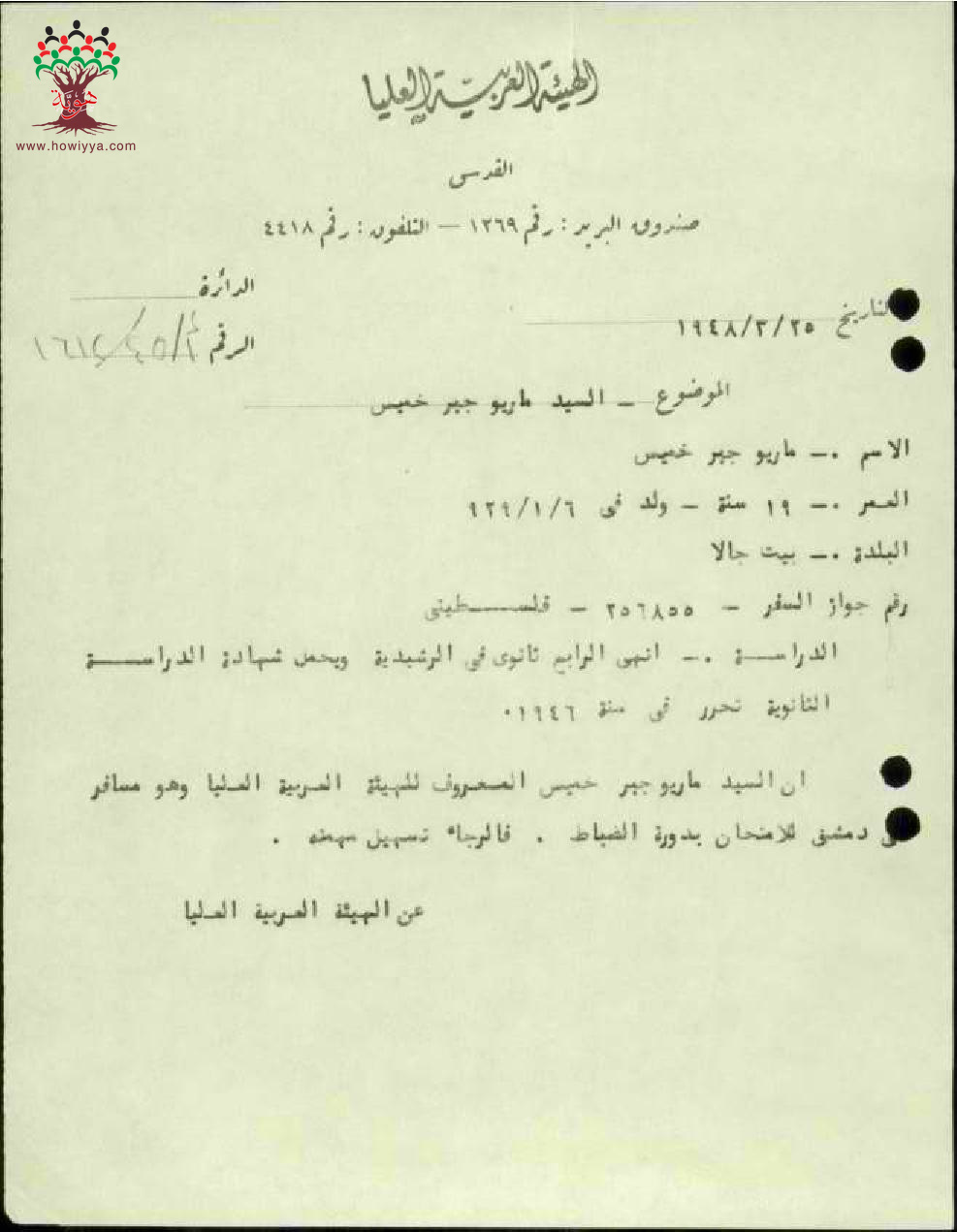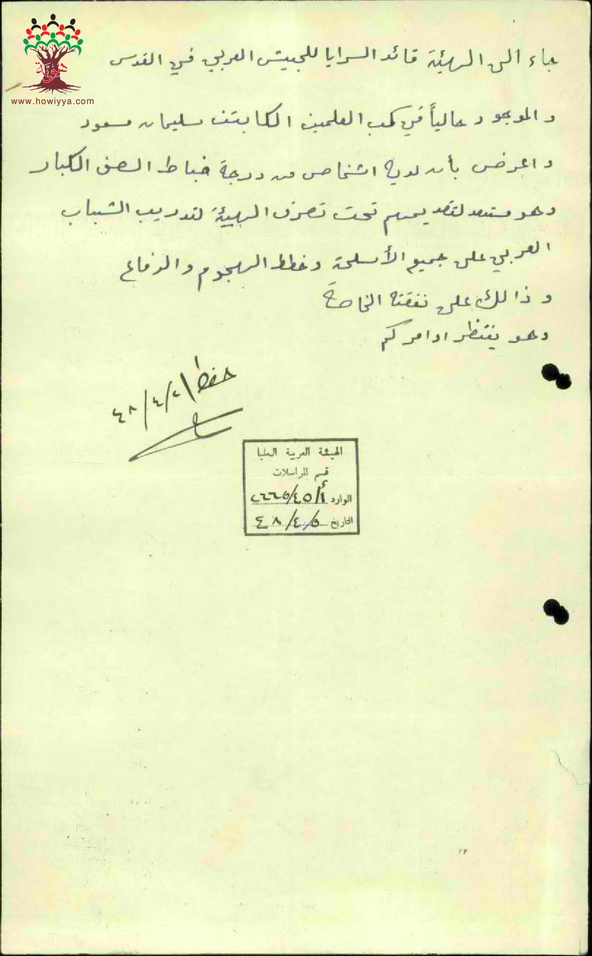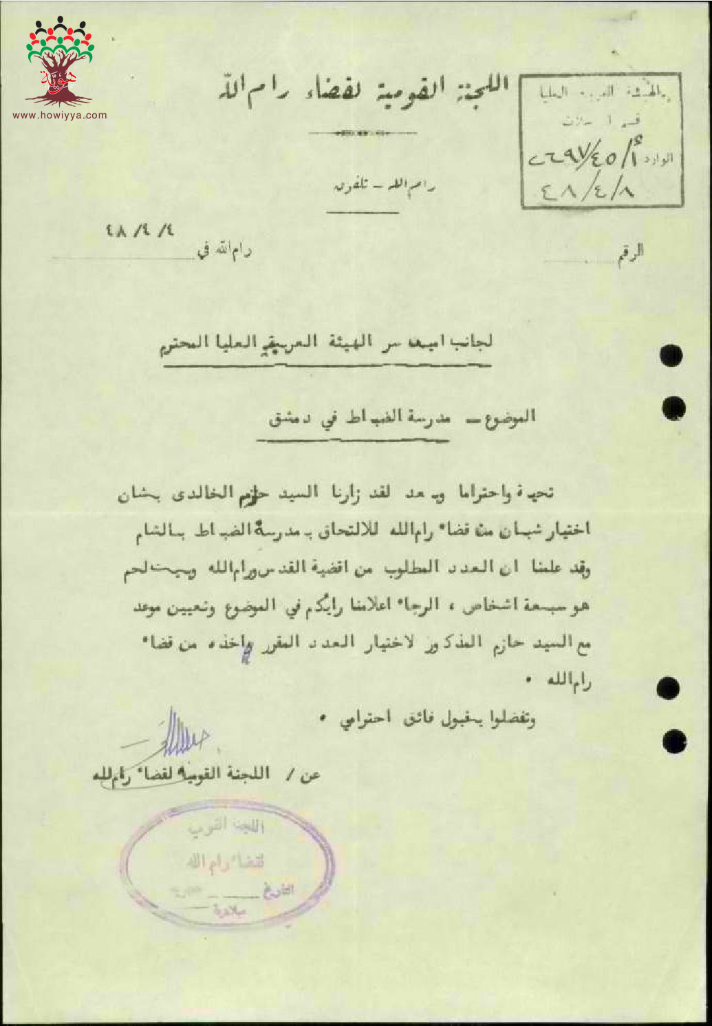 مجموعة رسائل من لجان الشباب الى الهيئة العربية العليا بخصوص التحاق بعض الشبان بمدرسة الضباط بالشام وفقا لطلب الهيئة